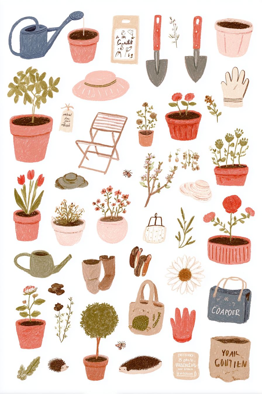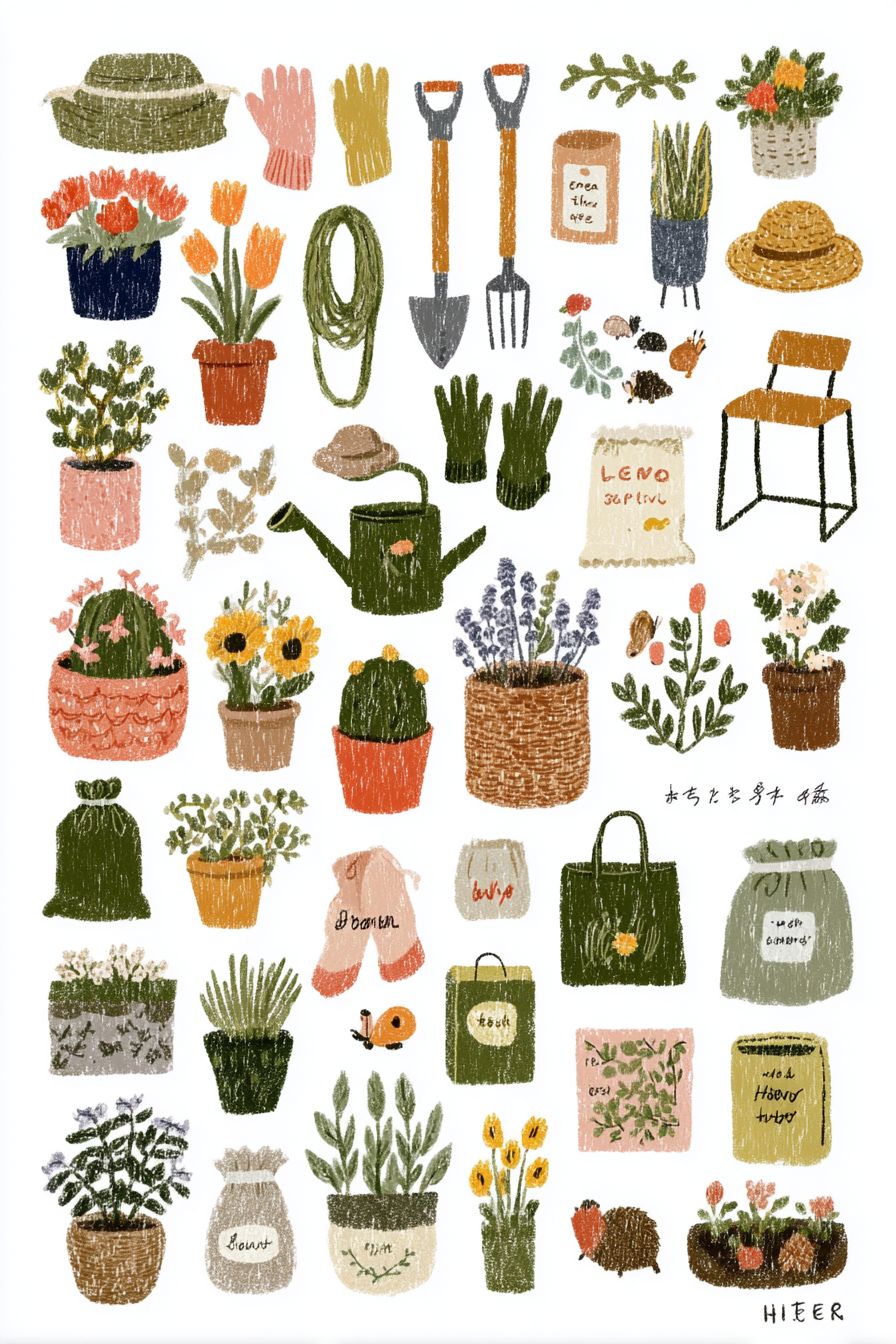 A collection of 50 cute hand-drawn gardening icons with crayon or colored pencil texture, themed around plants and nature. Includes [flower pots, watering cans, shovels, gloves, seed packets, sprouts, hoses, cactus, succulents, leaves, garden chairs, compost bins, sunflowers, tulips, lavender, roses, daisies, baskets, hats, herbs, birds, butterflies, tomatoes, garden labels, fertilizer bags, moss, snails, bees, pebbles, vines, ivy, garden boots, small trees, insects, hedgehogs, soil bags, watering cans, leaves, branches, mini plants]. Soft paper texture, slightly wobbly lines, pastel palette of green, yellow, cream, brown, and apricot. No white border. Background should appear clean white, but the final file must be transparent PNG with no visible outline or background layer. All text must appear in English only. --ar 2:3 --profile a88wstj