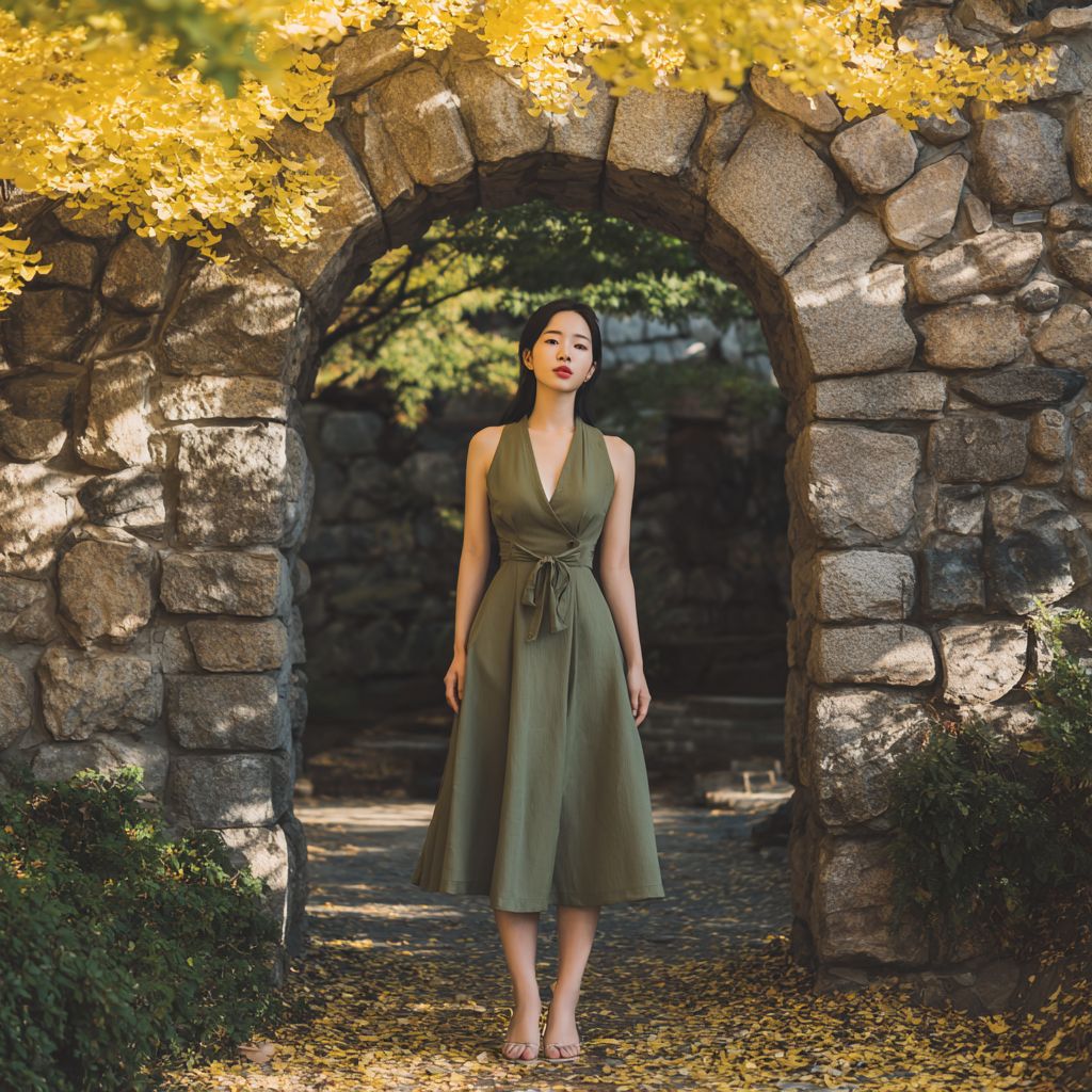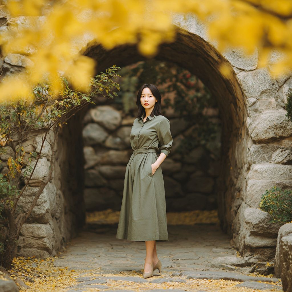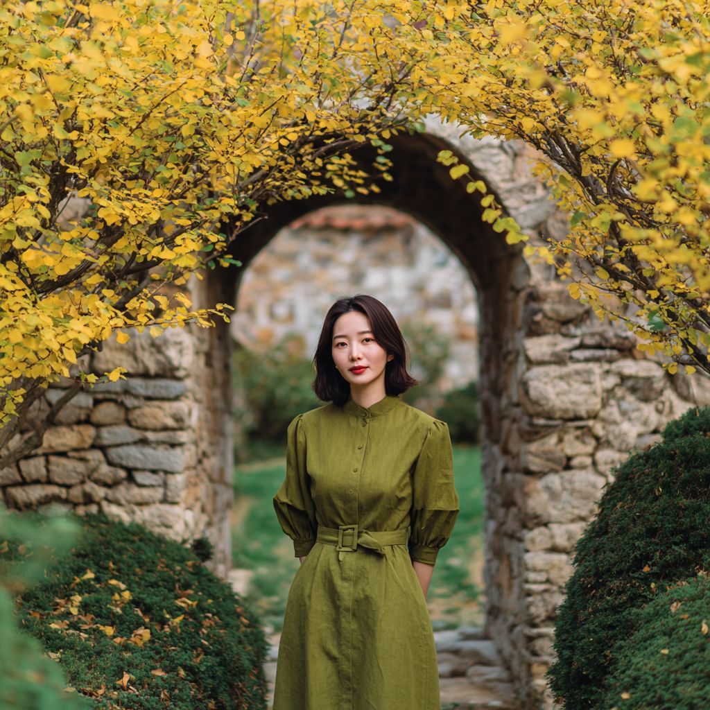 Eine koreanische Frau in einem olivgrünen Midi-Kleid steht nahe einem Steingartenbogen, umgeben von gelben Blättern, in einem eleganten und friedlichen Ganzkörperporträt