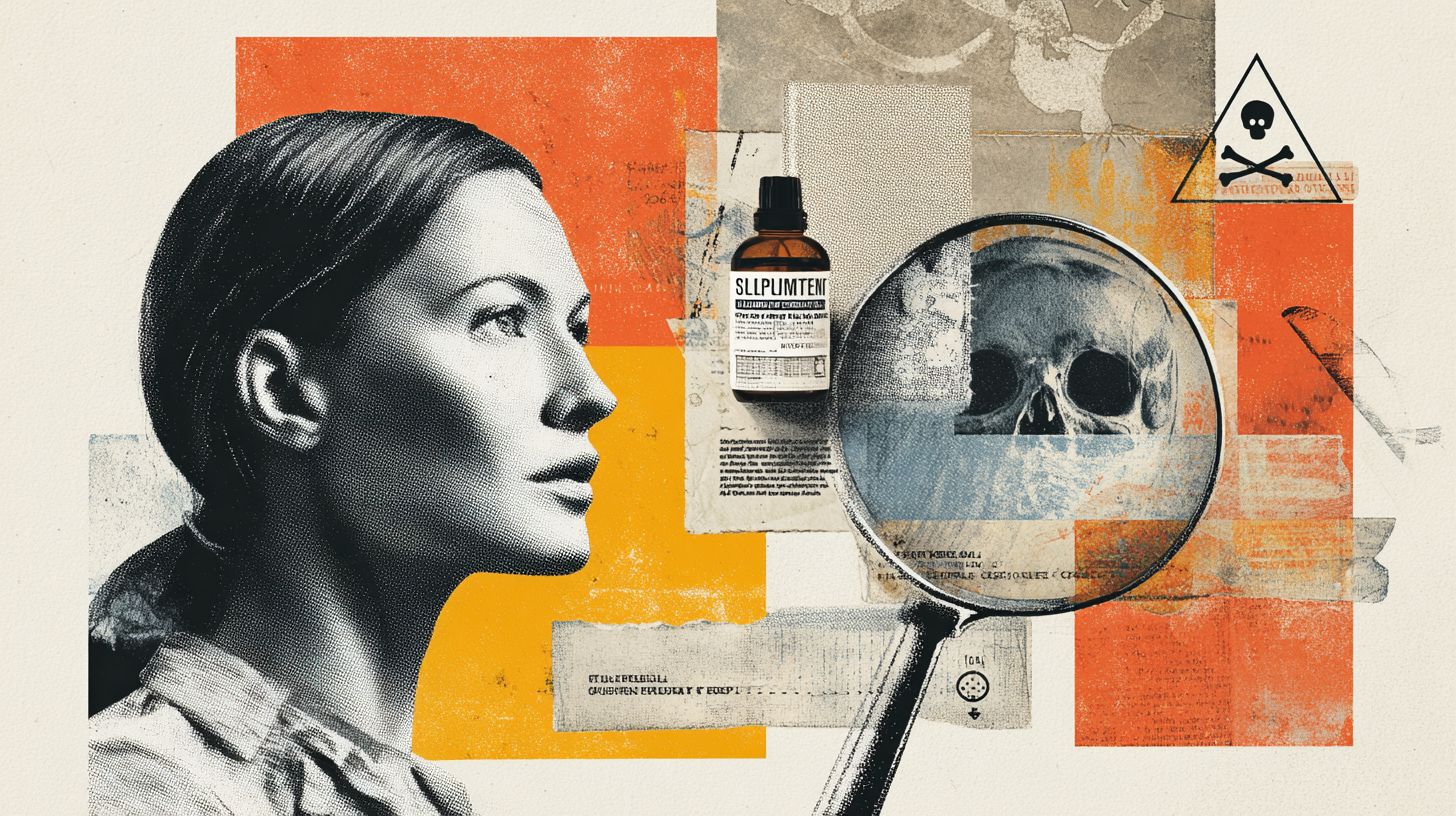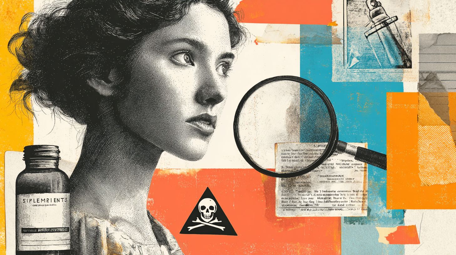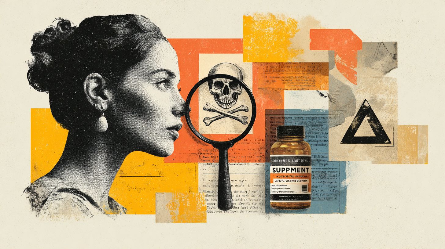 Editorial collage in the style of VOX and modern TE blog graphics, using the exact composition from a health-illustration sketch. A thoughtful woman is placed clearly on the left side, shown as a semi-realistic cutout portrait with clean edges and subtle duotone shading. She looks toward the center. In the center of the image, place a large magnifying glass. Directly behind the magnifying glass is a simple supplement bottle, clearly visible through the glass, with a readable label that says SUPPLEMENT?. On the right side, place three hazard elements arranged vertically or diagonally in a clean, intentional layout: a warning triangle, a skull-and-crossbones, and a crossed-out microscope. Each should appear as collage cutouts, such as taped notes, clipped cards, or paper scraps. Integrate layered but controlled collage materials: paper fragments, taped corners, clipped textures, subtle torn edges. Keep the layout organized and balanced, not chaotic. Use bold but unspecified color blocking for the background, allowing palette freedom. Overall style: crisp editorial collage, mixed media, clean composition, sharp cutout edges, modern health-journalism visual metaphor. --ar 16:9 --raw --v 7.0