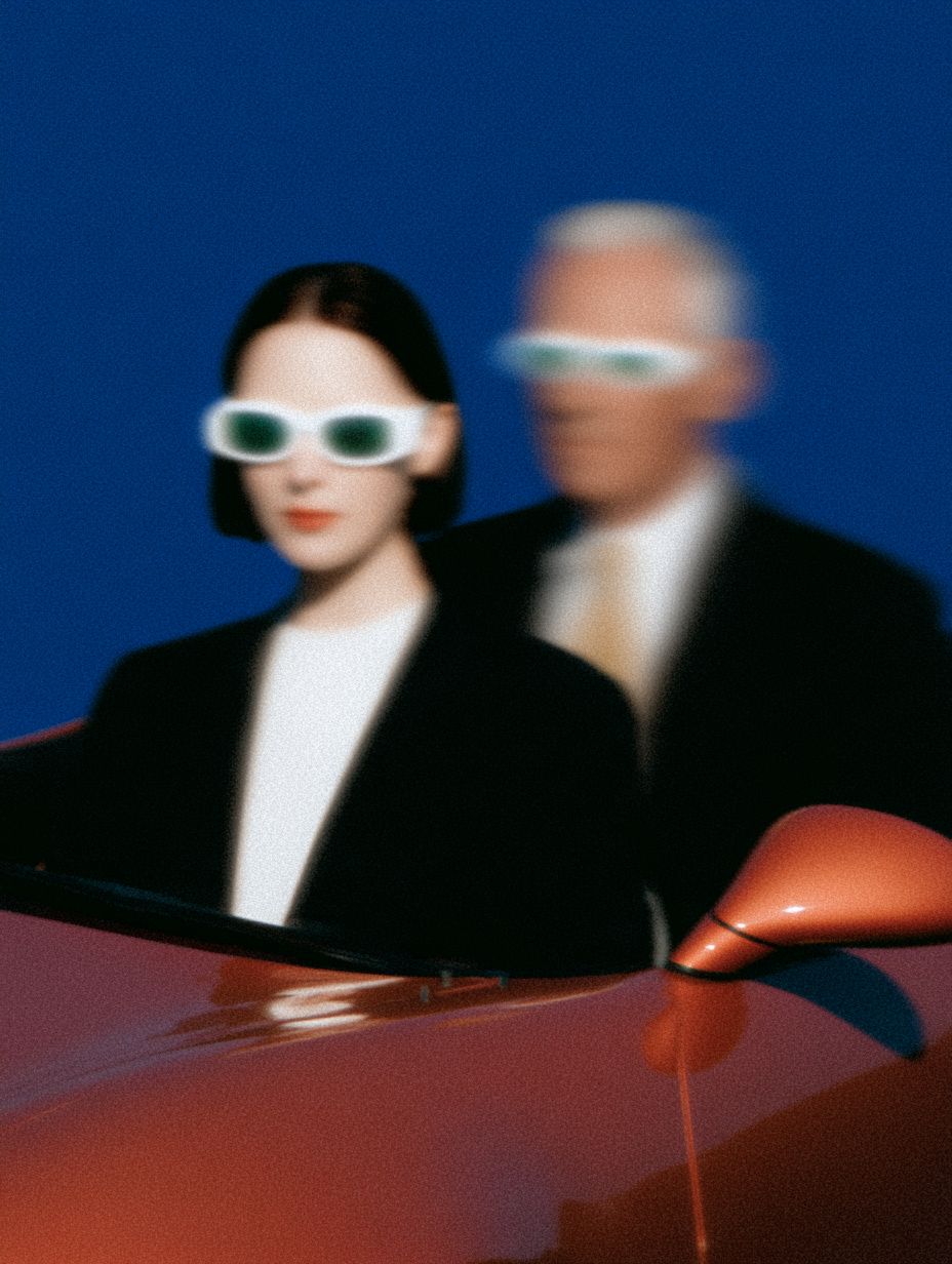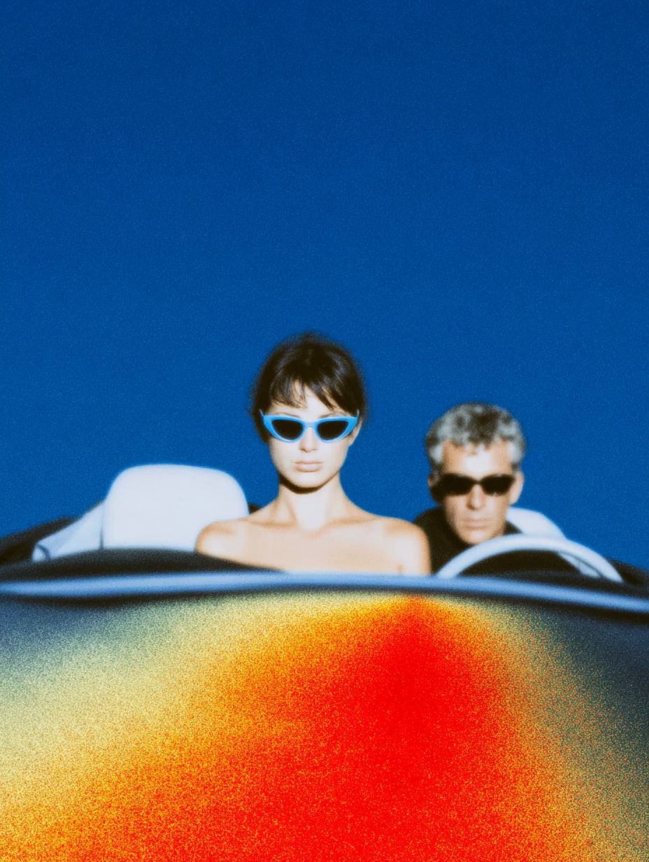 Eine Frau mit Sonnenbrille fährt ein Sportauto, neben ihr sitzt ein Mann
