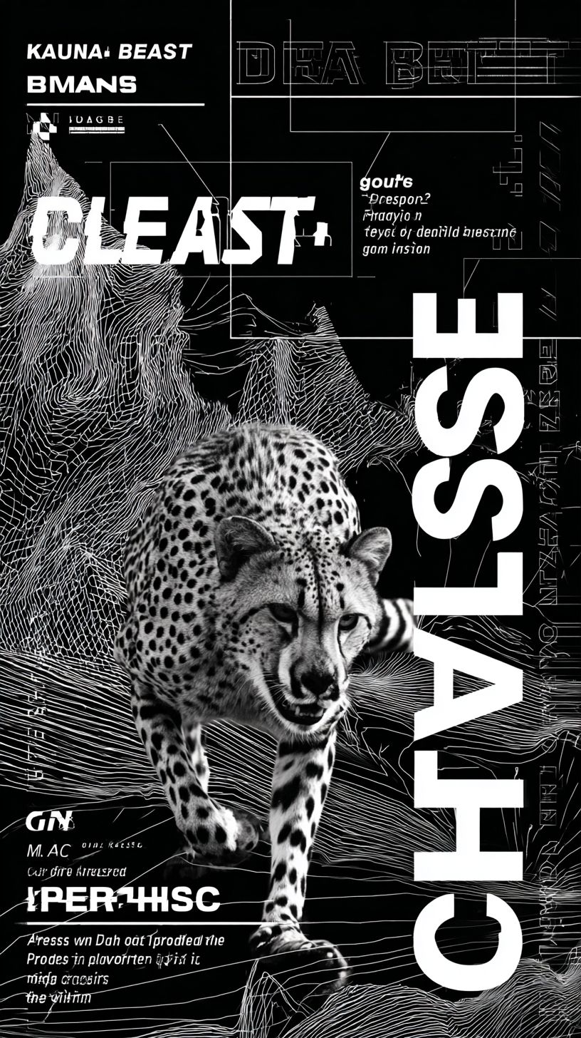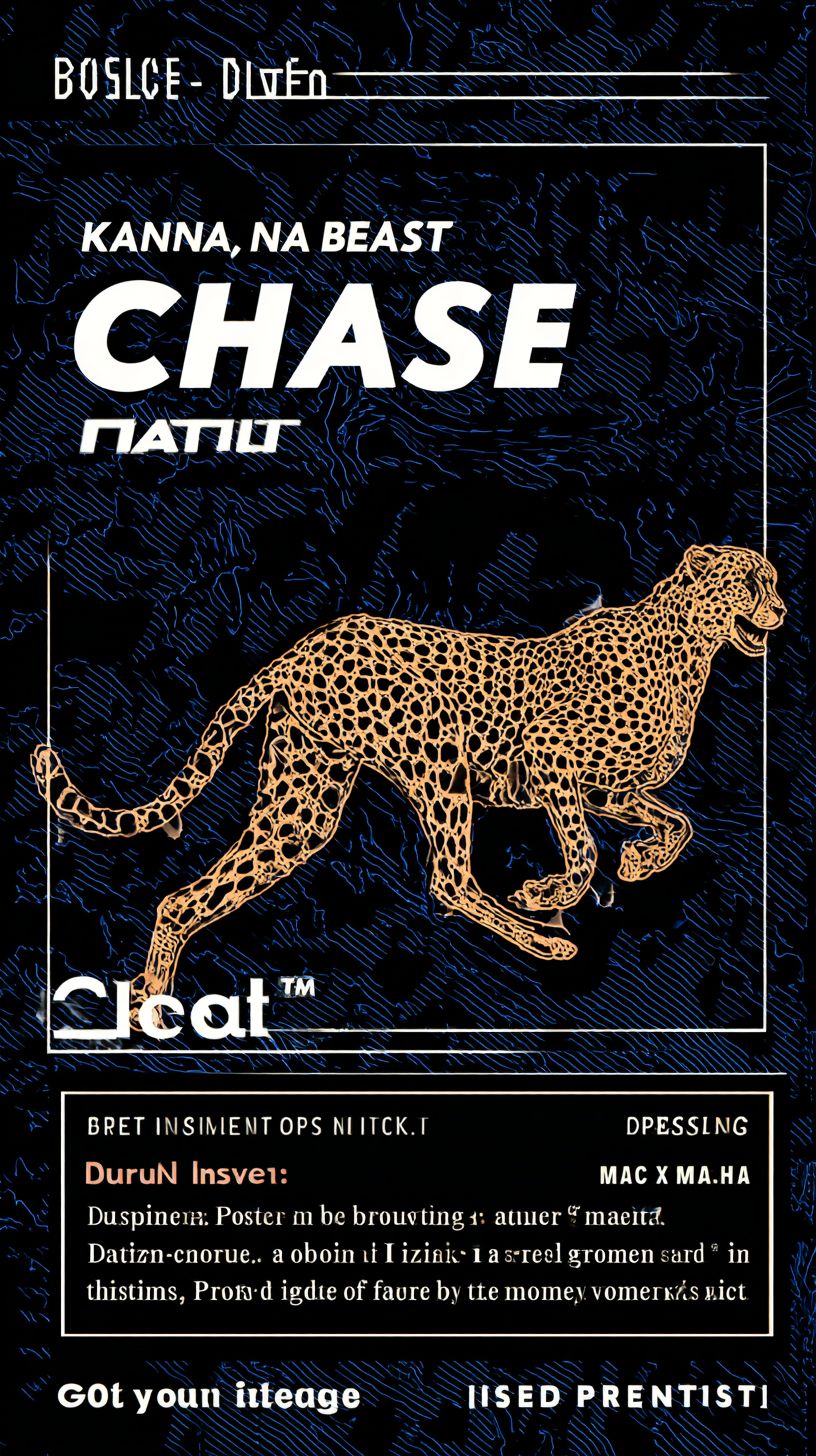 Plakatkunst mit einem dünnen redaktionellen Rahmen (einem Käfig), der allen Text enthält. Außerhalb des Rahmens: Gepard im Sprint, wilde Linienarbeit, kinetische topografische Energie, die nach außen entweicht. Industrie-Schriftart geometrisch, industriell, quadratische Enden. Im Rahmen: Oben: GROSSBUCHSTABEN ‚KANNA BEAST‘; Darunter: GROSSBUCHSTABEN ‚DESIGN BY INSTINCT‘; Zentrum: große GROSSBUCHSTABEN ‚CHASE‘; Unterhalb des Zentrums: Slogan in Satzschreibung ‚Go after what pulls you‘. Unterer Block: Stämmen Beschreibungen in Satzschreibung: ‚Durban Poison (Sativa) Tunnelvisionsklarheit. MAC 1 (Ausgewogener Hybrid) hebt die Stimmung, erdet den Körper. Fokus des Räubers ohne nerviges Gefühl.‘ Ästhetik mit hohem Kontrast zwischen Wildnis und Ordnung.