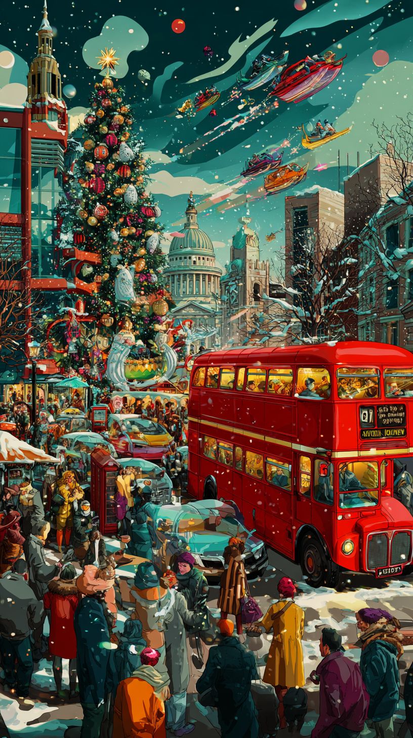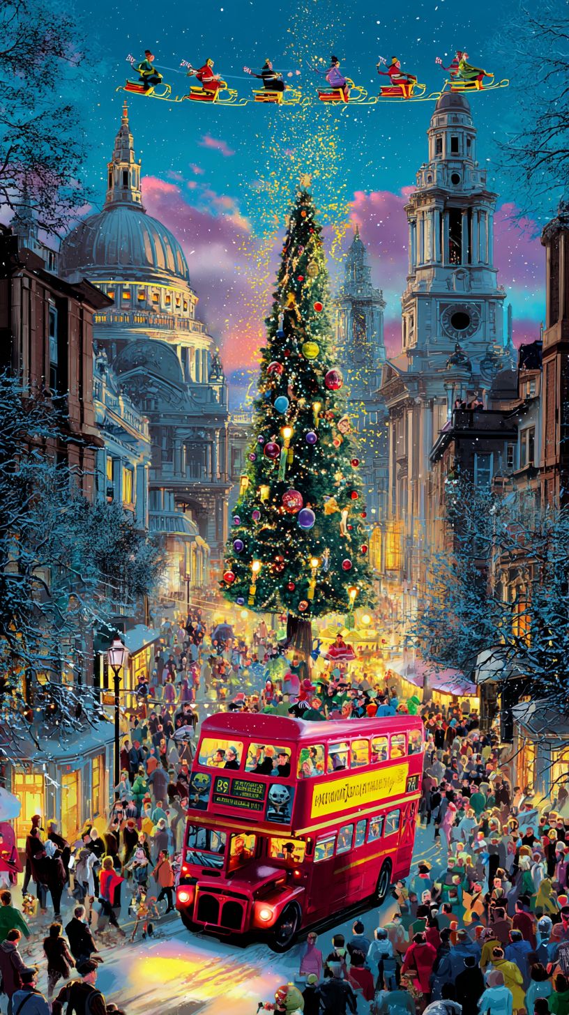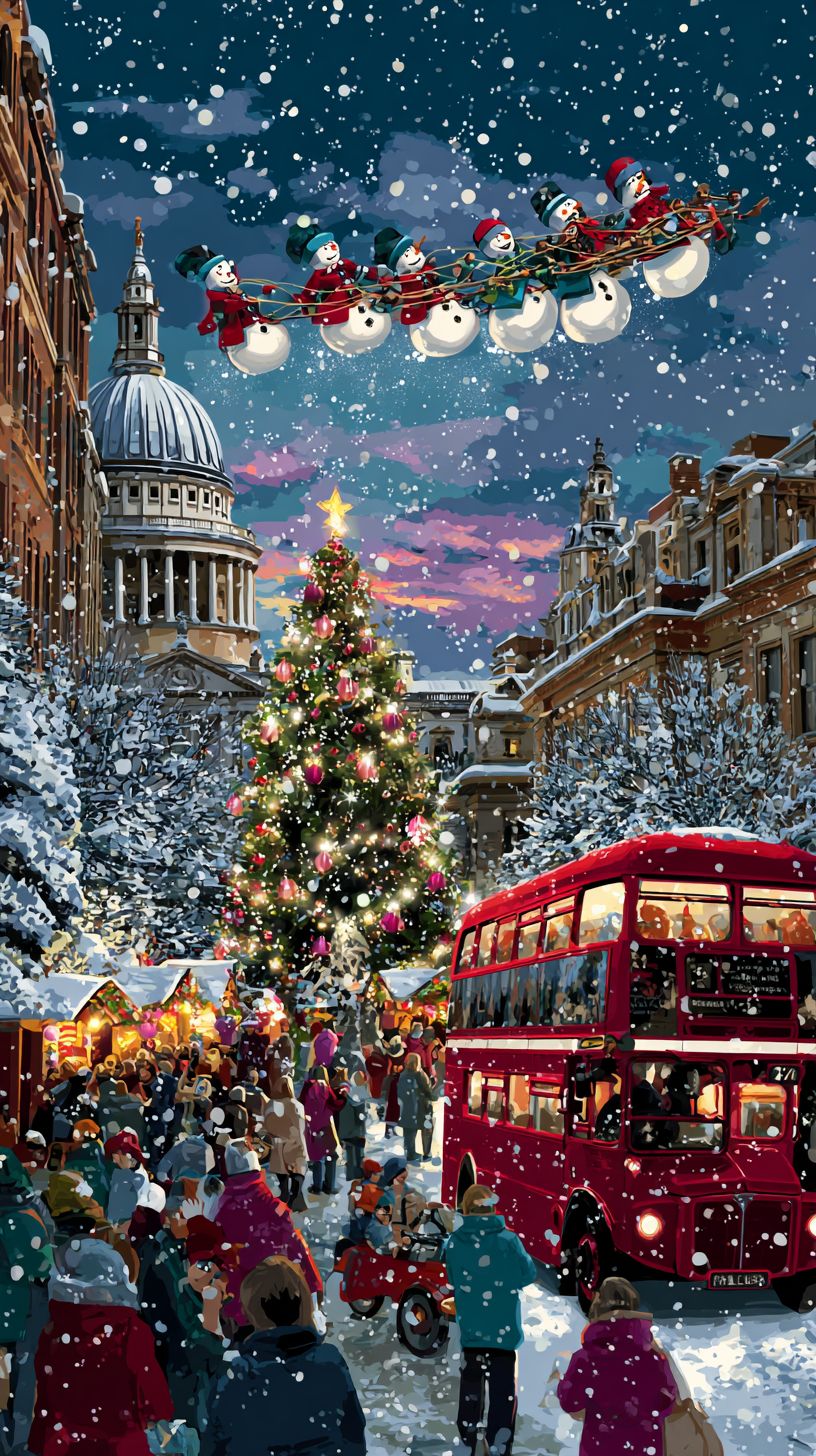 In der Mitte steht ein Weihnachtsbaum, umgeben von einem geschäftigen Weihnachtsmarkt und einem roten Doppeldeckerbus auf der Straße, während Leute umhergehen. Die Stadtsilhouette umfasst die St. Paul's Cathedral und Big Ben im Hintergrund. Eine Menschenmenge hat sich versammelt, um Kindern zuzusehen, die bunte Schneemänner in der Luft reiten, alles vor dem Hintergrund eines winterlichen Himmels mit leicht fallendem Schnee. Die allgemeine Stimmung fängt den festlichen Geist mit funkelnden Lichtern, Dekorationen und geschäftiger Aktivität in einem Vintage-Illustrationsstil ein.