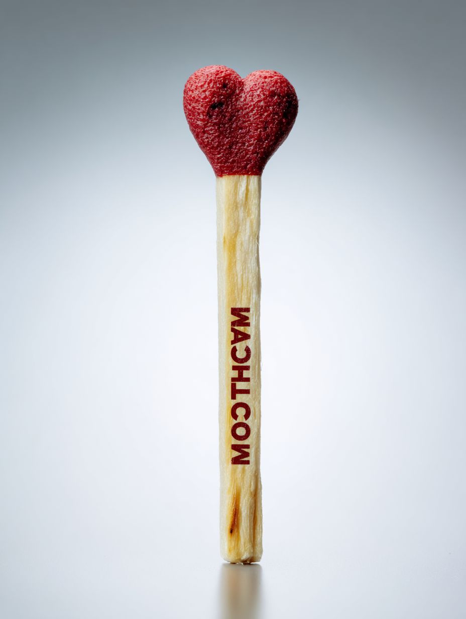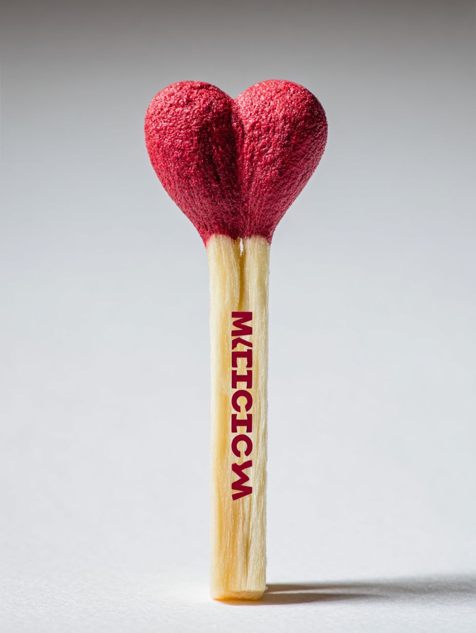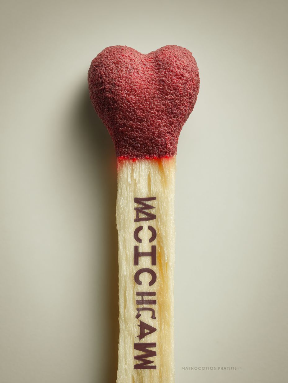 The Love heart matchstick: a vertical matchstick full size with the coarse red lightable end is shaped like a heart, it has the text "MATCH.COM" in a clean sans-serif font in CAPS on the side, Macro shot, ultra-realistic photography style, studio lighting, isolated on a light neutral background, ultra-realistic photography --ar 3:4 --raw --v 7.0 --p 78soi4x --s 50