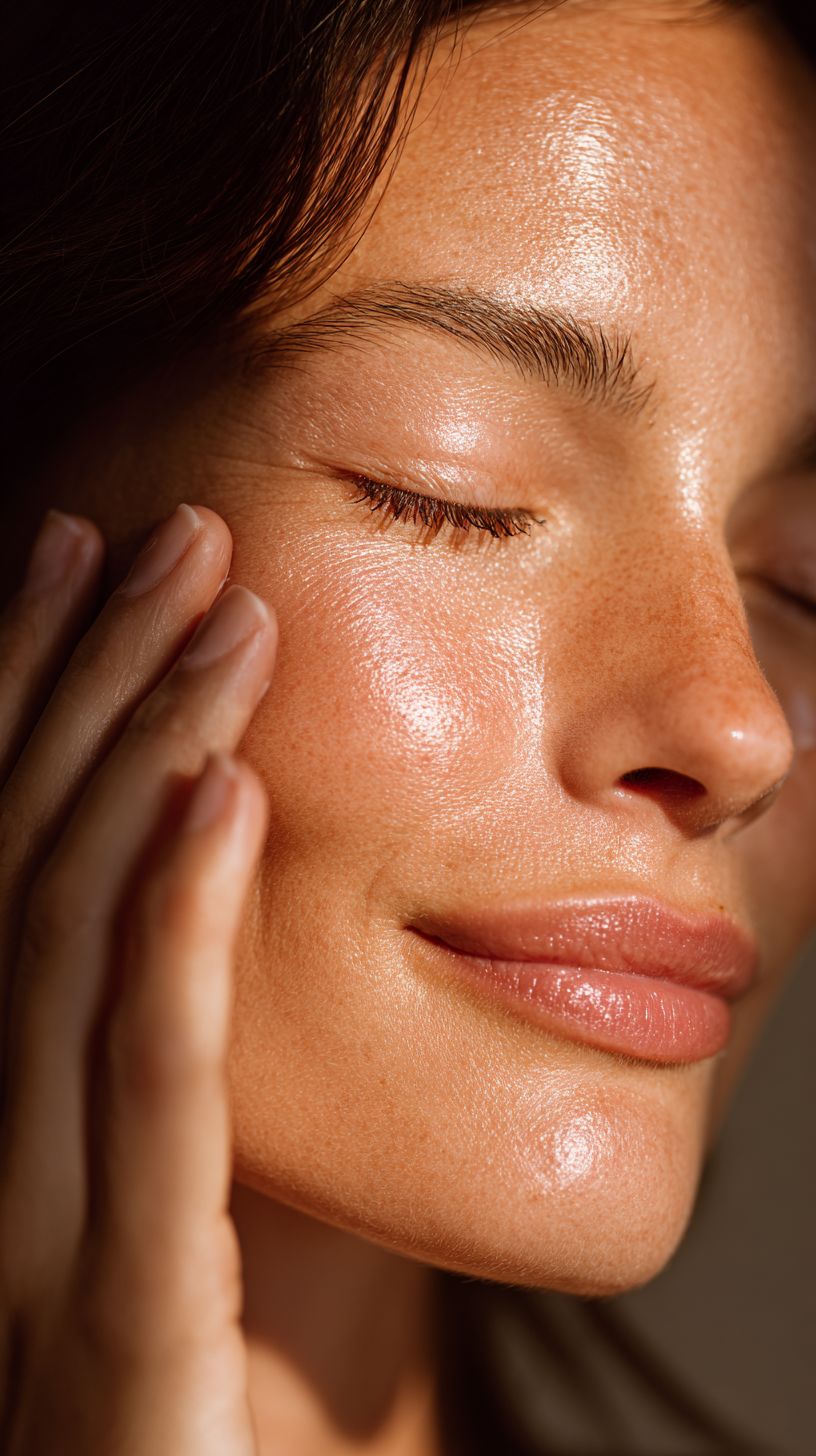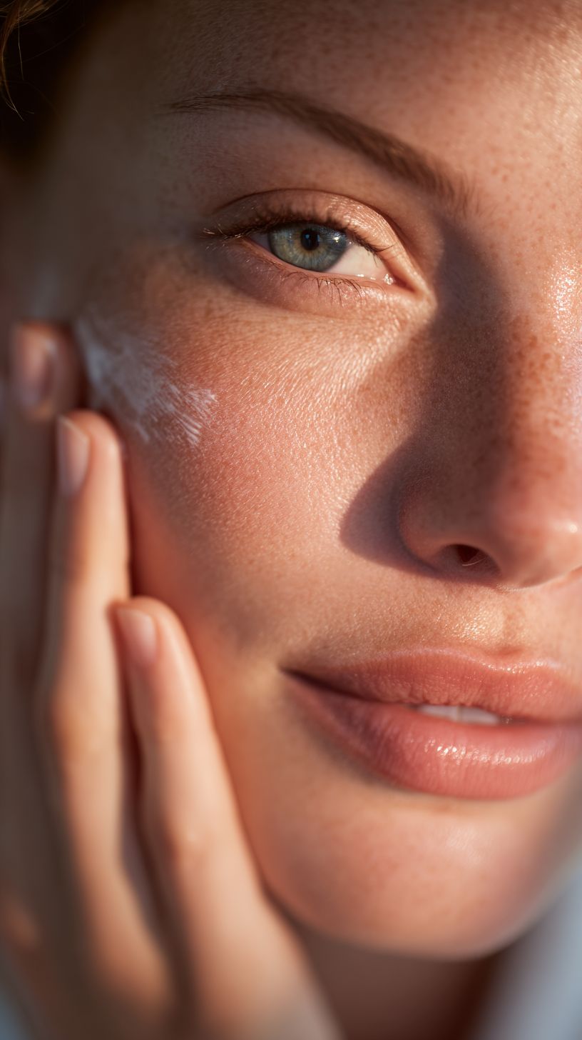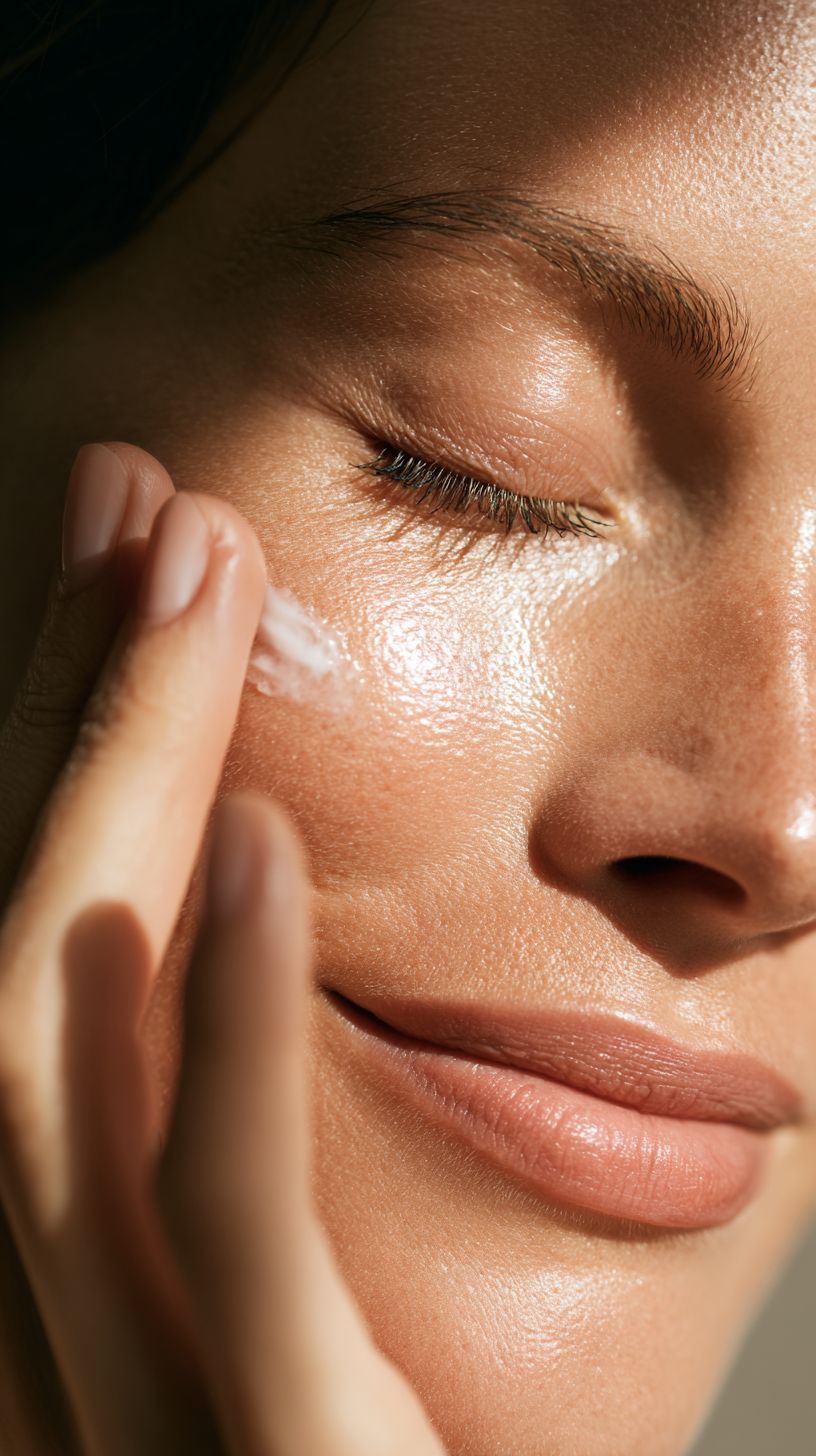close-up of a woman applying natural skincare cream on her face , glowing smooth skin, soft natural light highlighting texture, serene and balanced atmosphere, minimalistic background, luxurious and premium beauty photography, cinematic depth of field, ultra-realistic, high-end skincare aesthetic --ar 9:16 --v 7.0