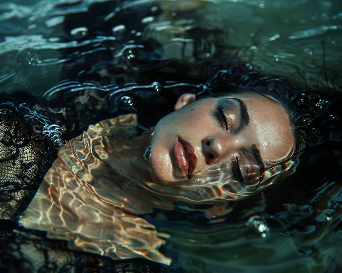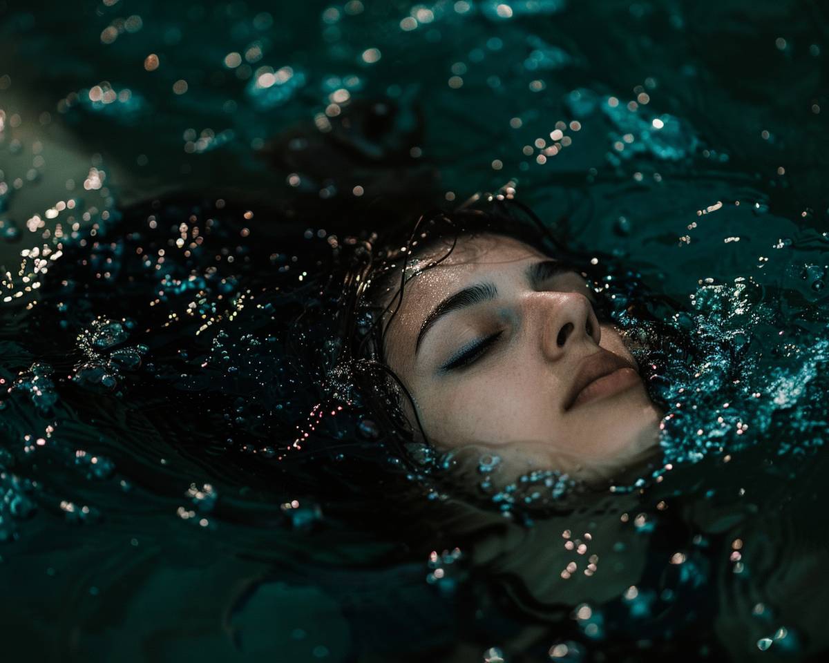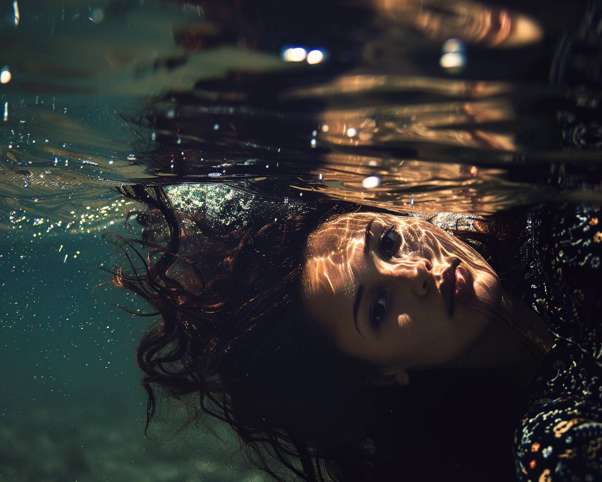 Ein dunkles Unterwasserfoto einer Frau, die im Wasser liegt.