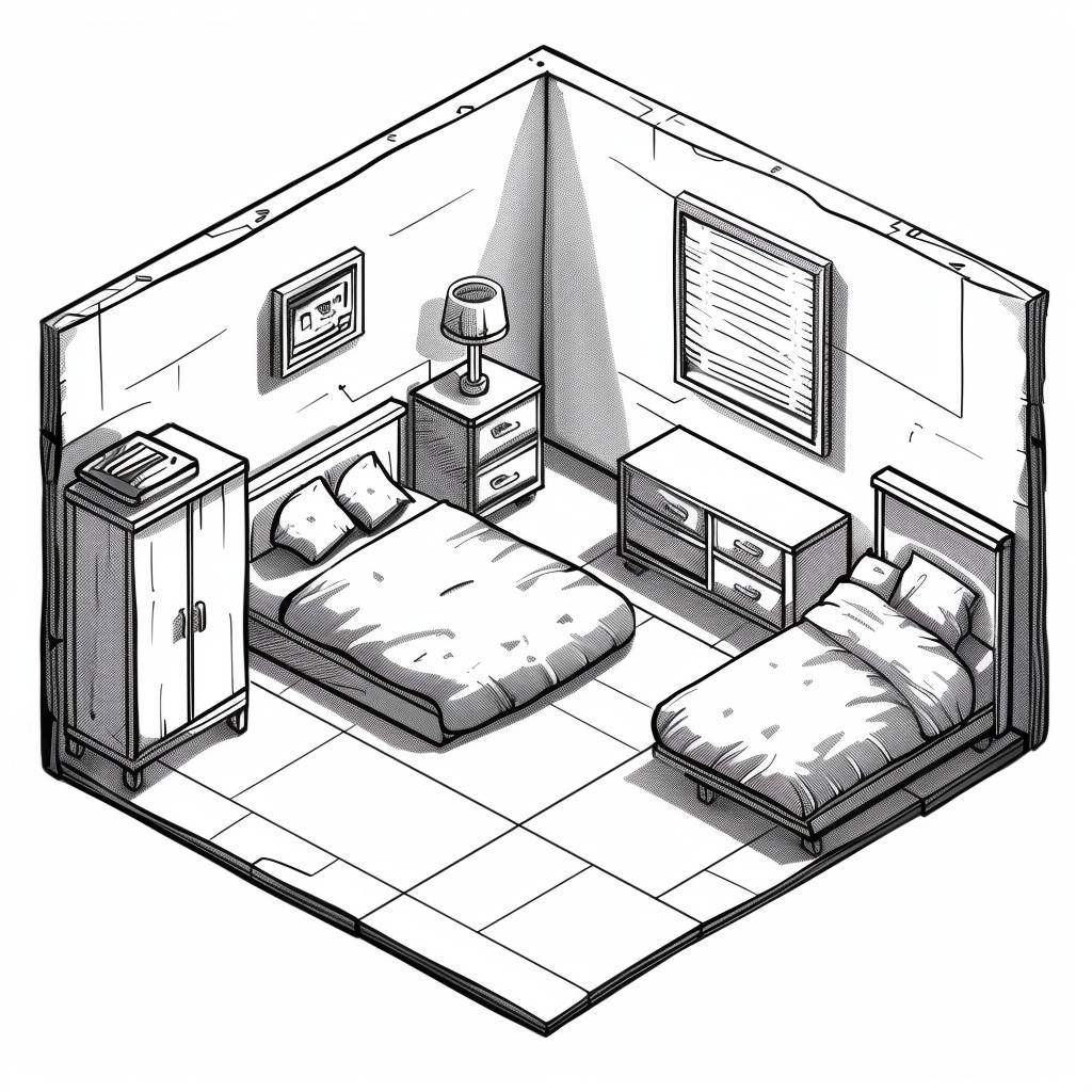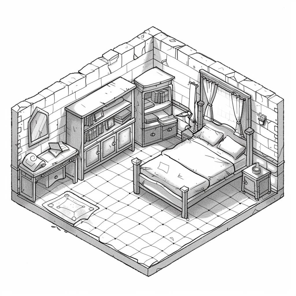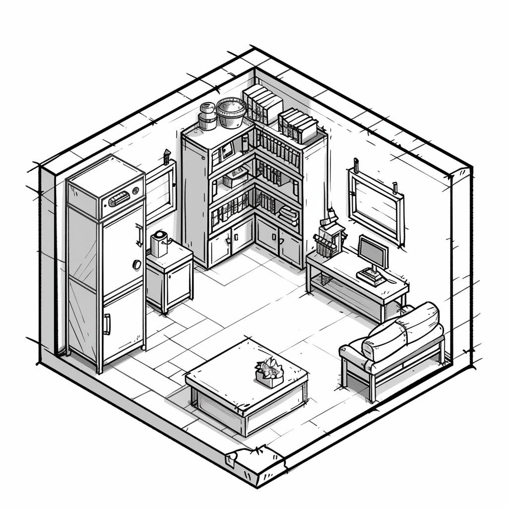 Schwarz-weiße Linienkunst eines isometrischen Raums im Stil von RPG Maker, mit leuchtenden Farbelementen, einfachem Design, weißem Hintergrund und weißer Bodenerklärung.