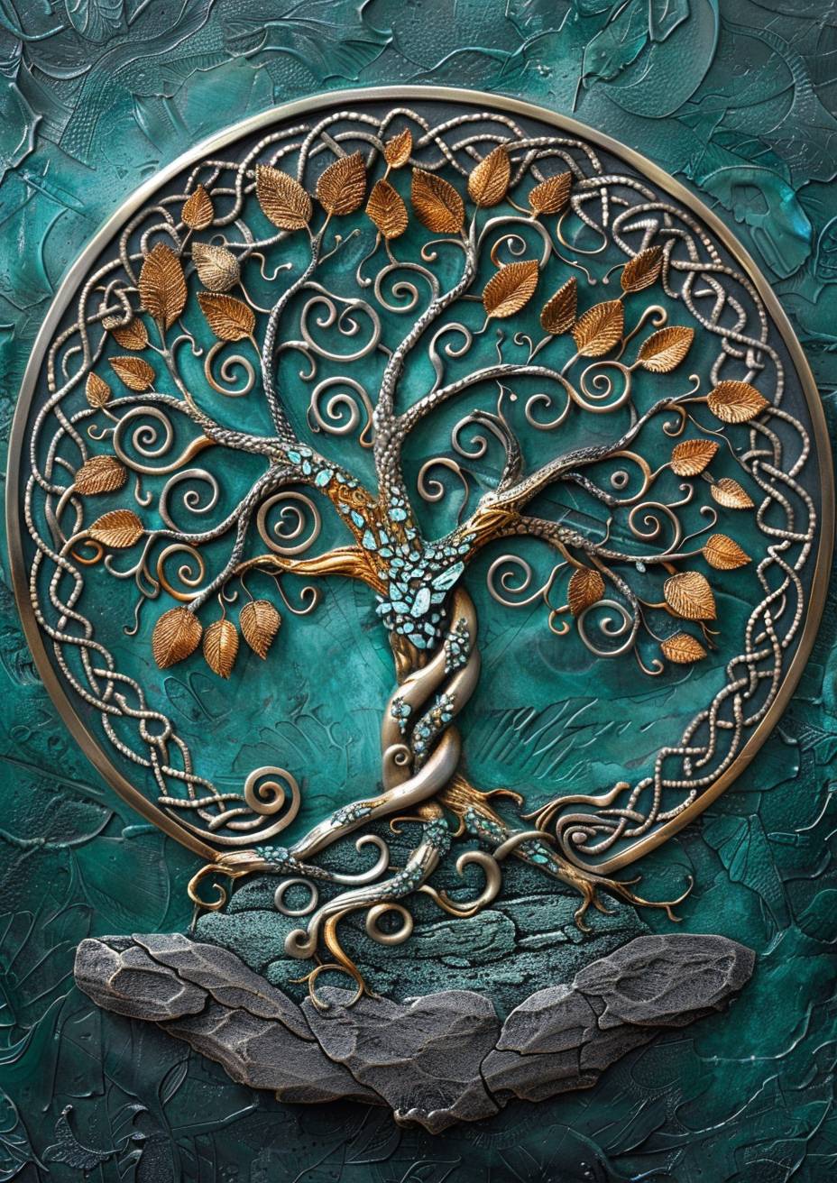 Aufwendige Wikinger-Knotenkunst aus Silber, Kupfer und Teal mit komplexen Details, die einen Fibonacci-spiralbaum des Lebens und Tenebrismus zeigt, leuchtende strahlende Farben.