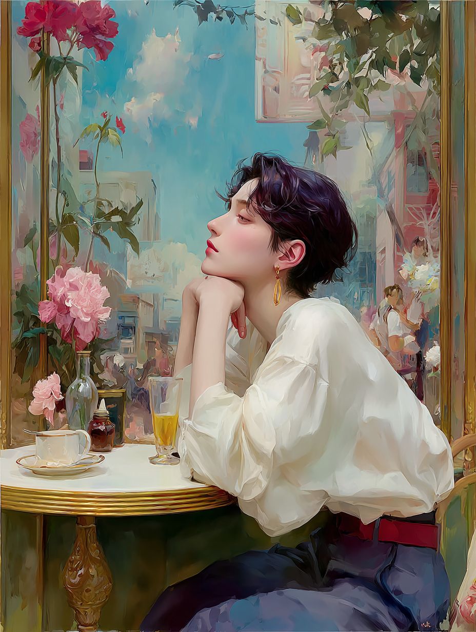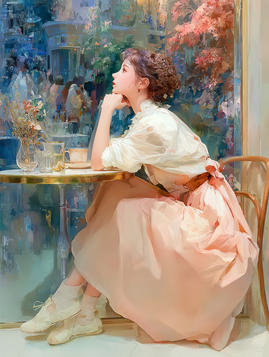 Semi-3D Anime-Stil, inspiriert von Suzume no Tojimari und Makoto Shinkai, emotionale ruhige Stimmung, Rückansicht einer Person, die an einem Tisch in einem Café sitzt und nach draußen schaut, sanfte Sonnenstrahlen auf dem Glas, gemütliches Interieur, gemütliche Stadt draußen, subtiler Reflexion an der Glaswand, vertikale Komposition.