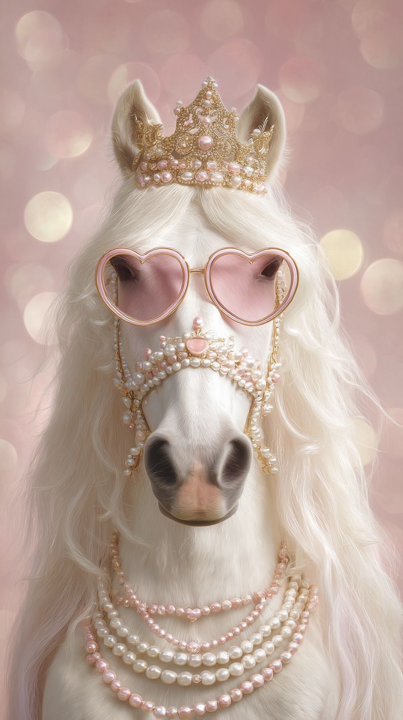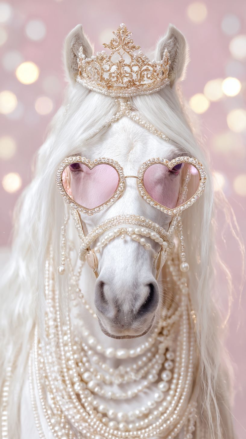a glamorous white horse portrait, front view, elegant aristocratic style, the horse wearing a delicate golden crown with pearls, long blonde mane decorated with multiple pearl strands, layered pearl necklaces around the neck, pink heart-shaped sunglasses with thin metal frame, soft pastel pink background with subtle bokeh lights, luxurious fashion editorial aesthetic, whimsical royal vibe, ultra detailed fur texture, realistic horse anatomy, soft studio lighting, high fashion photography, dreamy and romantic mood, shallow depth of field, fine art portrait, extremely detailed, clean composition, centered subject, no text, no logo --ar 9:16 --s 50 --v 7.0 --raw