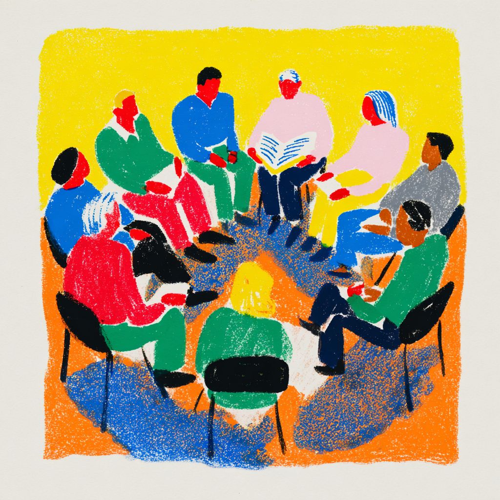 Ein kleines Treffen zur Genesung im Kreis von Stühlen, eine Person spricht und hält ein großes Buch, andere hören aufmerksam zu, diverse Erwachsene, ruhige unterstützende Ausdrücke, Innenraum, warmes Nachmittaglicht, warme handgezeichnete Illustration, halbrealistische Menschen, papierartige Textur, Atmosphäre eines Genesungstreffens.