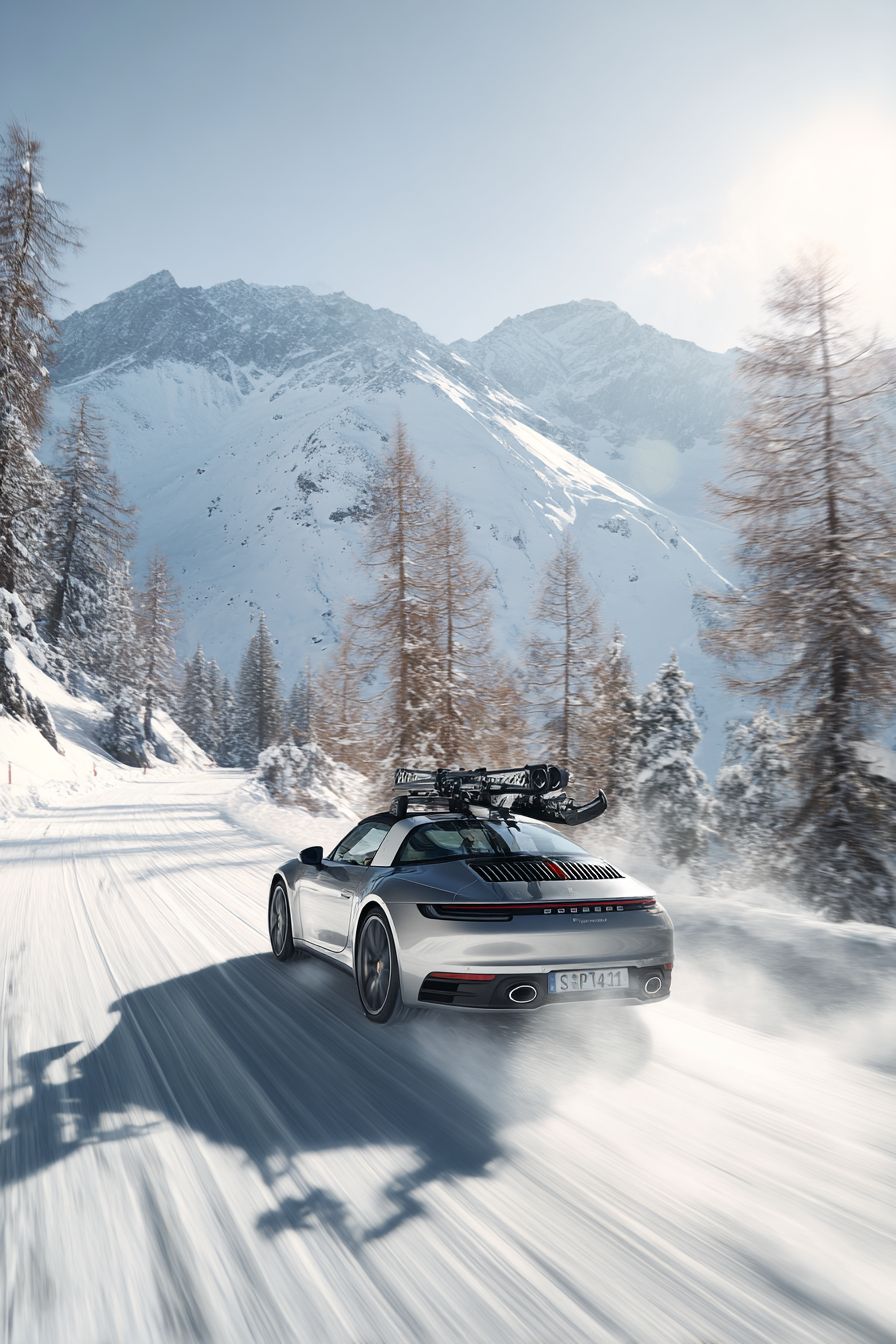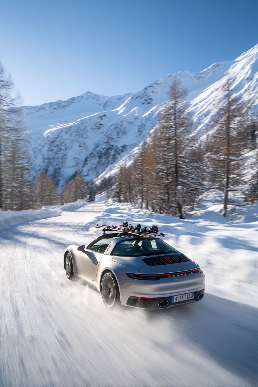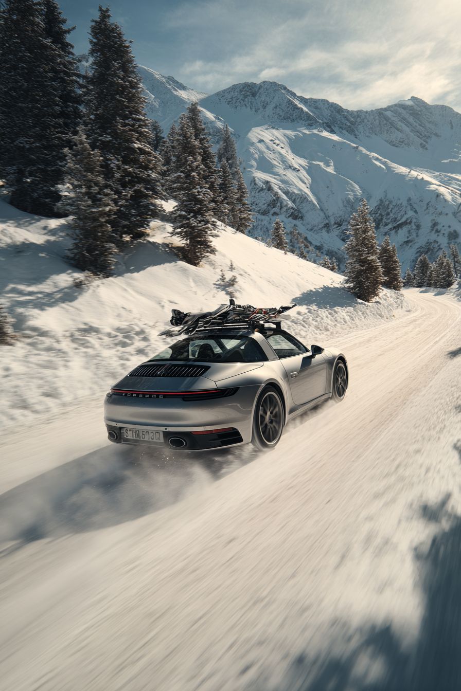 Ein silberner Porsche 911 Targa 4S fährt schnell auf einer verschneiten Bergstraße