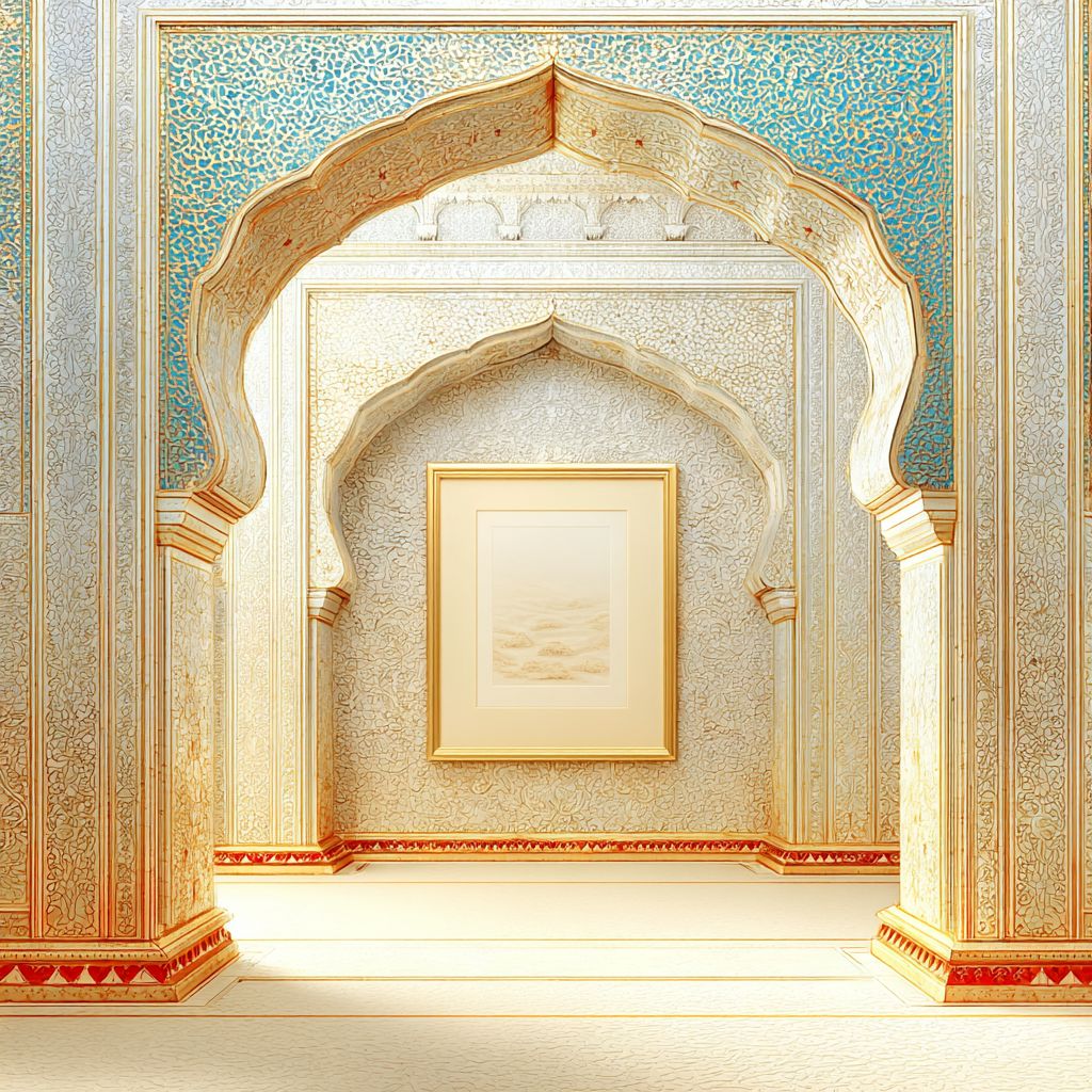 Minimal wall art frame in an Indian palace corridor, carved stone walls and arches, muted beige and ivory palette, single framed artwork with empty canvas, centered composition, soft diffused lighting, quiet royal atmosphere, luxury heritage interior aesthetic, no people --ar 1:1 --sref 1146717604 --stylize 200 --raw