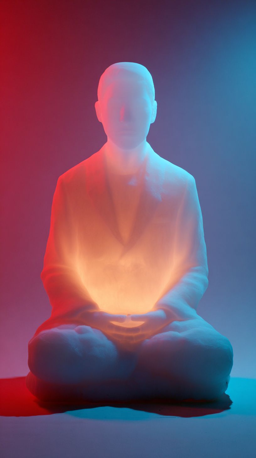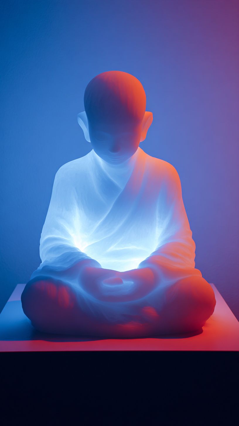 Eine minimalistische weiße Lichtskulptur einer meditierenden Person, die von innen mit einem warmen, sanften Glühen leuchtet und unscharfen Details, vor einem blauen Hintergrund mit einer roten Akzentfarbe.