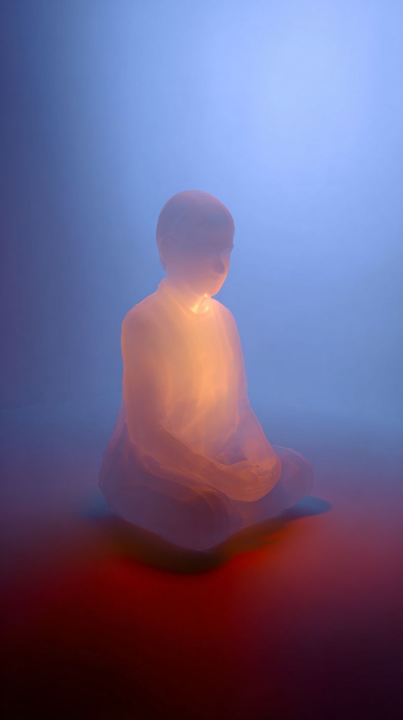 a minimalist white light sculpture of a person meditating, glowing from within with a warm, soft glow and blurred details, set against a blue background with a red accent color. --ar 9:16 --raw --s 50
