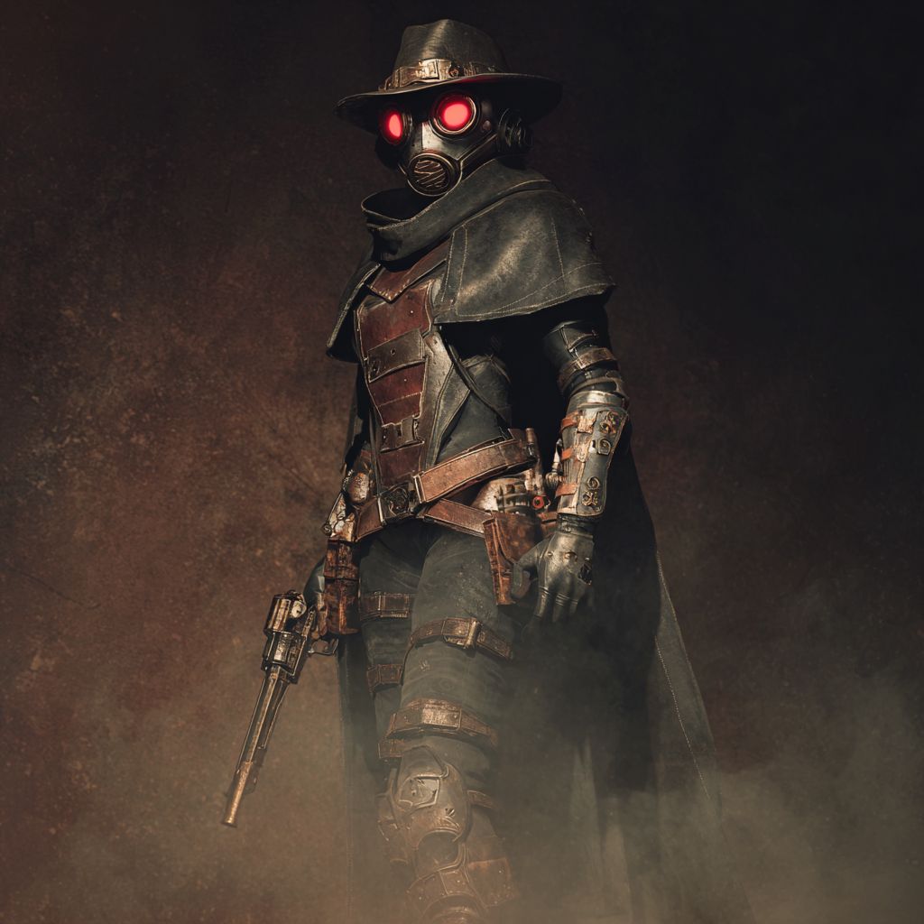 Eine weibliche Revolverheldin in schwarzer Steampunk-Rüstung mit leuchtenden roten Augen in einer dunklen Ödnis