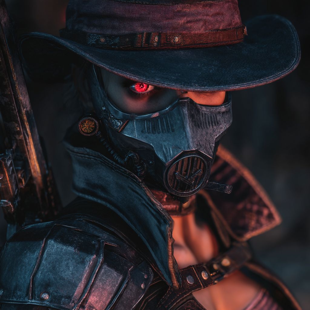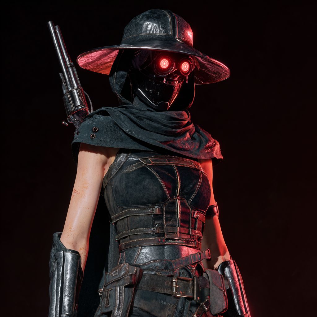 Eine weibliche Gunslinger, die eine schwarze Steampunk-Rüstung trägt und in der Dunkelheit der Nacht in der Einöde mit scharf leuchtenden roten Augen steht, in einem Vollgesichtsschutz und einem Ganzkörperdesign, im Stil eines Videospielporträts.