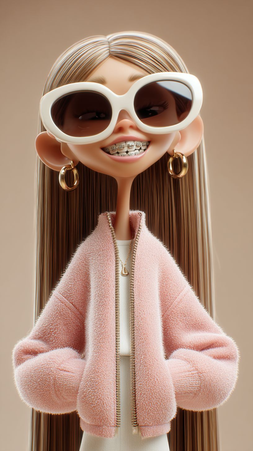 Stylized cartoon fashion girl character, designer toy / vinyl doll aesthetic, oversized head, smooth sculpted face, glossy finish, long light brown hair, straight and silky, flowing behind shoulders, big expressive eyes, soft pastel tones, cute confident smile with clearly visible braces on teeth, full lips, soft rounded cheeks. Wearing a pink jacket, fashion-forward, slightly oversized fit, luxury cartoon fashion style, clean shapes, bold silhouette. Accessories: stylish sunglasses, modern jewelry accents, playful but high-end designer vibe. Style: high-quality 3D cartoon, vinyl toy / fashion illustration look, smooth surfaces, soft reflections, minimal texture, modern editorial character design. Background: clean pastel or muted studio color, minimal, focus entirely on the character. NO realism, NO photorealistic skin, no text, no watermark --ar 9:16 --raw --stylize 300