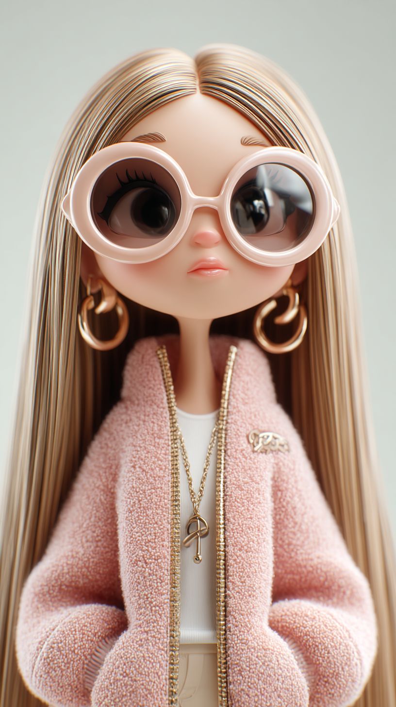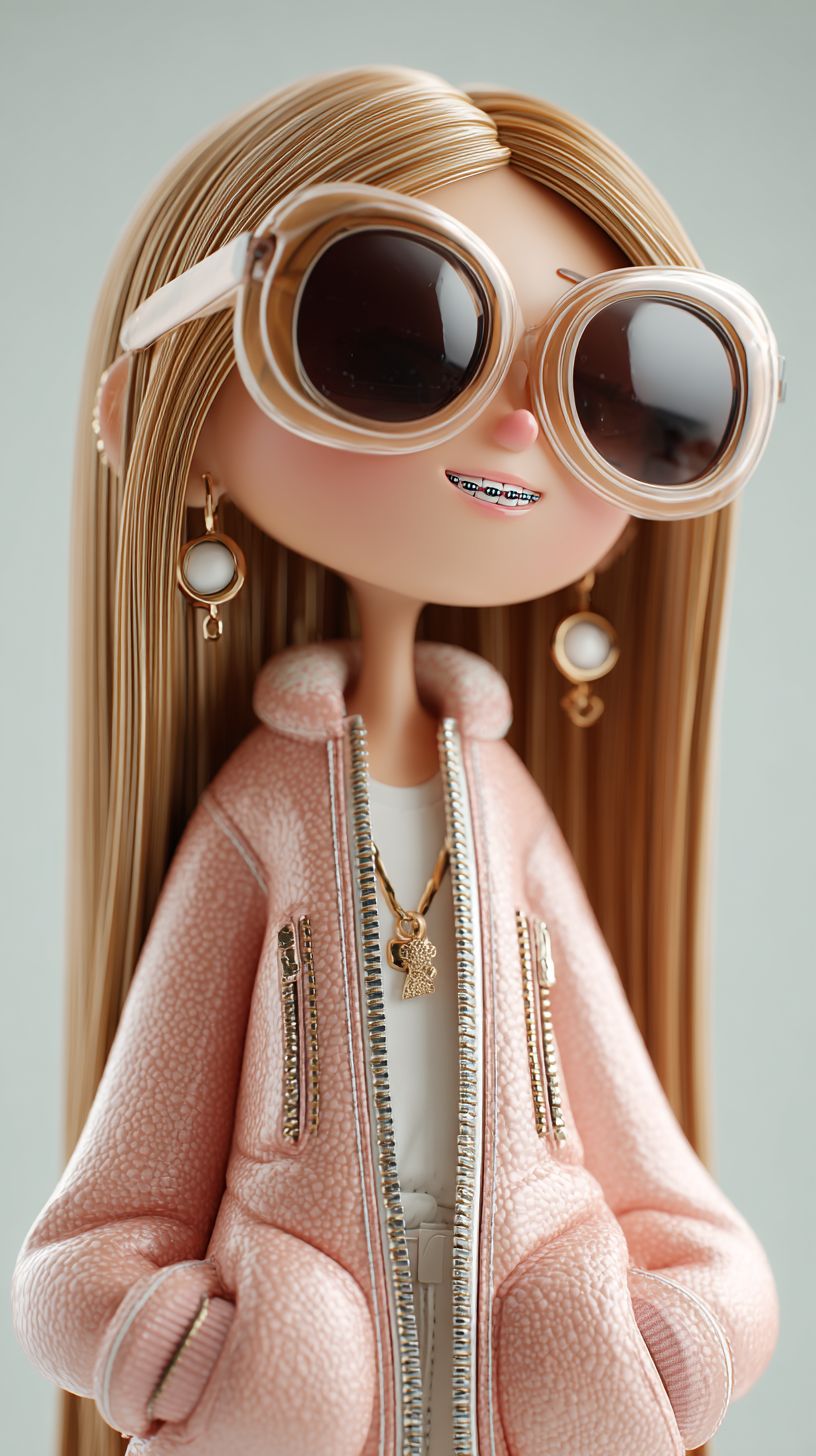 Stilisierte Cartoon-Mode-Mädchenfigur, Designer-Spielzeug / Vinyl-Puppen-Ästhetik, übergroßer Kopf, glattes sculptiertes Gesicht, glänzende Oberfläche, langes hellbraunes Haar, glatt und seidig, das hinter den Schultern fließt, große ausdrucksstarke Augen, sanfte Pastelltöne, süßes selbstbewusstes Lächeln mit deutlich sichtbaren Zahnspangen, volle Lippen, sanfte runde Wangen. Trägt eine rosa Jacke, modisch, leicht oversized geschnitten, Luxus-Cartoon-Mode-Stil, saubere Formen, kühne Silhouette. Accessoires: stilvolle Sonnenbrille, moderne Schmuckakzente, verspielte, aber hochwertige Designer-Atmosphäre. Stil: qualitativ hochwertige 3D-Cartoon, Vinylspielzeug-/Mode-Illustrationslook, glatte Oberflächen, sanfte Reflexionen, minimale Texturen, modernes redaktionelles Charakterdesign. Hintergrund: saubere Pastell- oder gedämpfte Studi Farben, minimalistisch, ganz auf die Figur fokussiert.