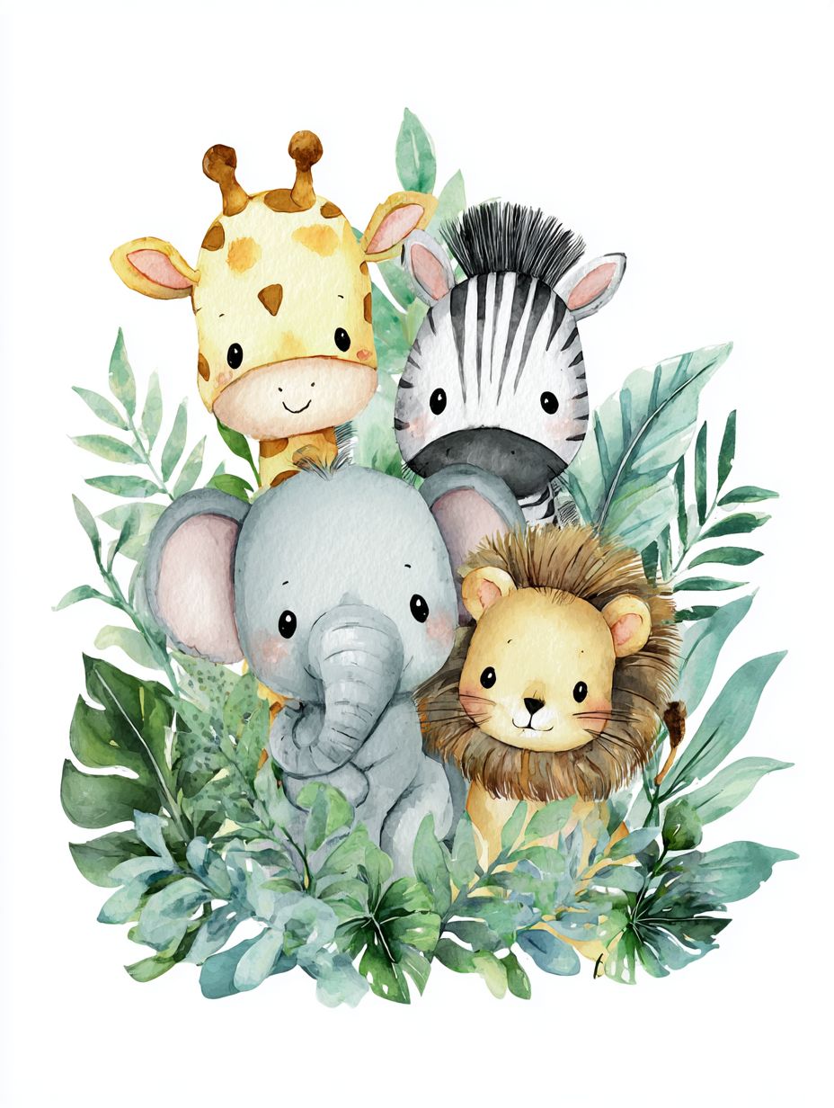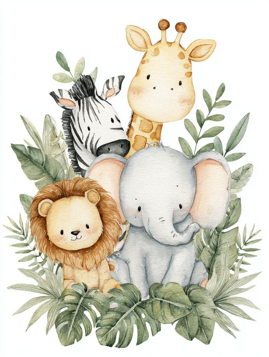 watercolor painting of a cute and adorable baby elephant, giraffe, lioness, and zebra in the style of pastel drawing art, surrounded by foliage clipart on a white background with no text, fonts, or letters, isolated on an empty white background with no shadows, green leaves around. --ar 3:4 --s 50 --raw