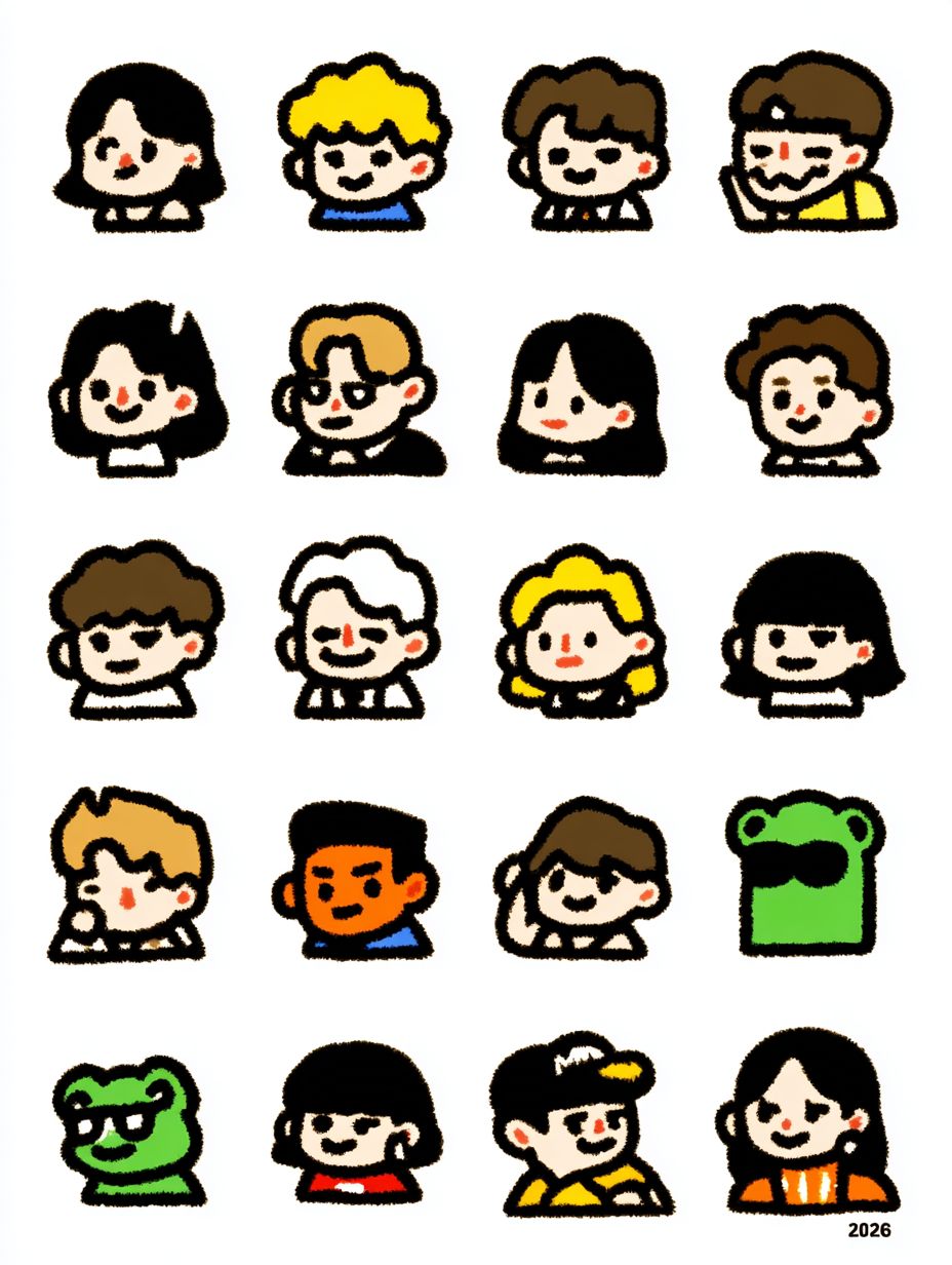 1000 völlig unterschiedliche Varianten von Cartoon-Charakter-Avataren, süße Jungen und Mädchen, stylisch wie Models, sehr individuell, angeordnet in einem Raster mit schwarzen Rändern, einschließlich Marvel- und DC-Charakteren sowie Pepe der Frosch und verschiedenen Variationen unbekannter Charaktere.