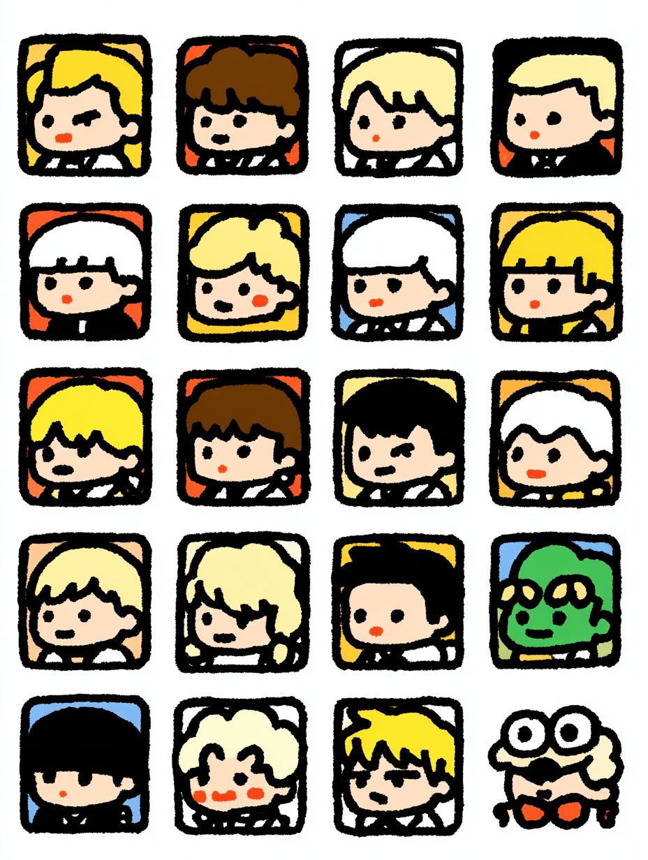 1000 completely different varieties of cartoon character avatars, cute boys and girls, stylish like models, very individual, arranged in a grid with black borders, marvel and Dc characters also included, pepe the frog too, different varieties of unknown characters --ar 3:4 --sref 768076288 --profile 4x1tjgy