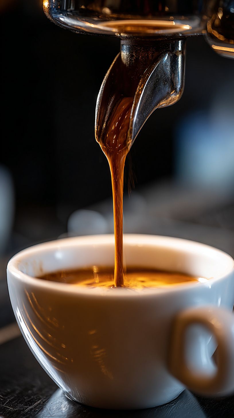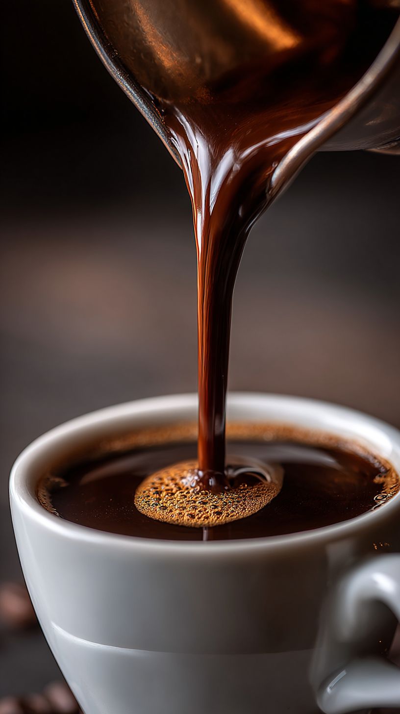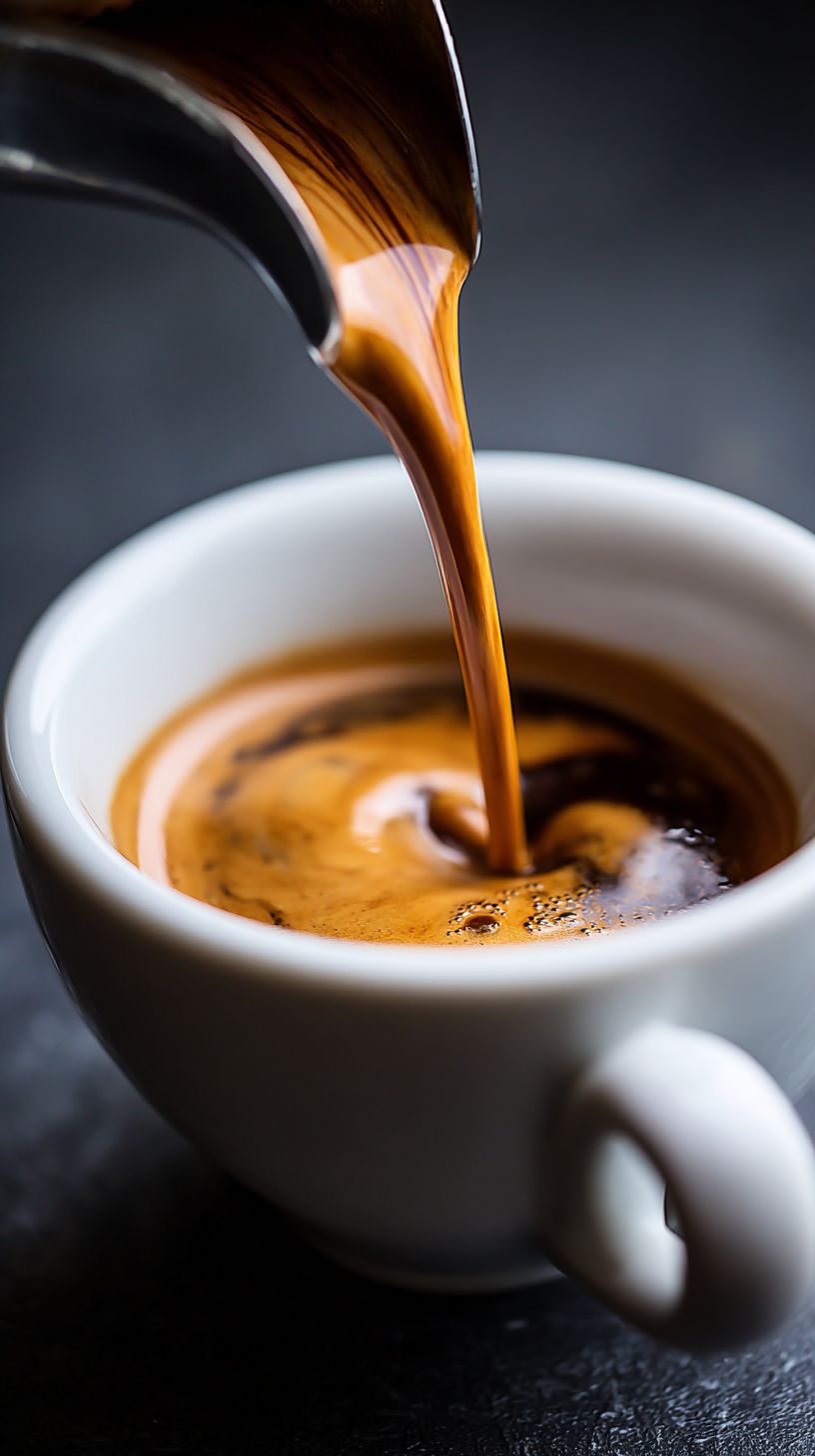 Extreme macro close-up, dark brown espresso liquid flowing in smooth parabolic stream from portafilter into white ceramic cup, crema forming on surface, golden-brown color, steam rising, warm side lighting, shallow depth of field, ASMR aesthetic --no cartoon, plastic, blurry --chaos 10 --ar 9:16 --raw