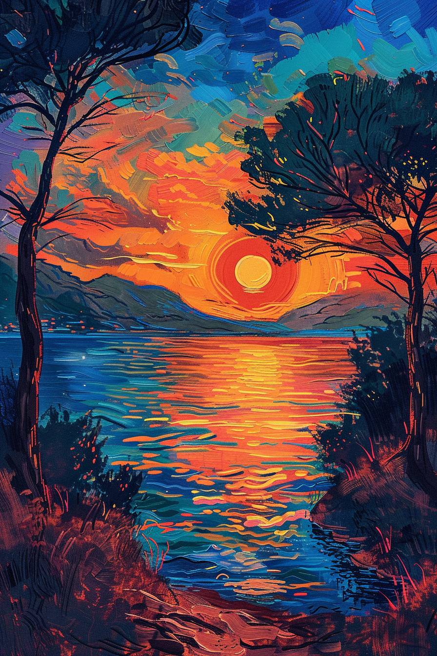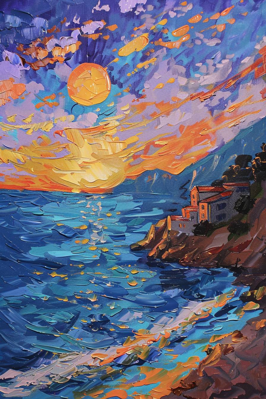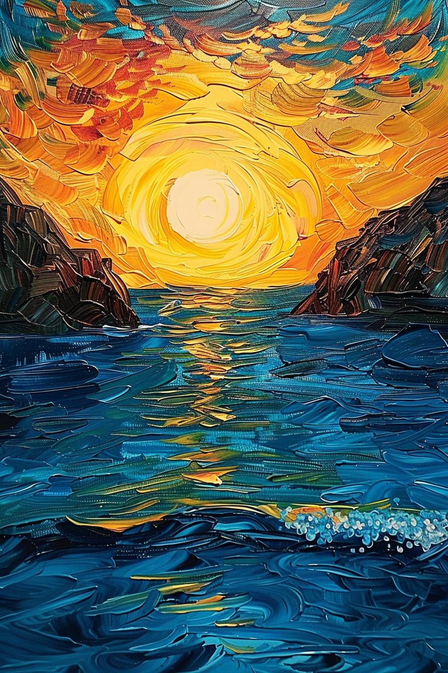 Ein Gemälde eines griechischen Sonnenuntergangs im Stil von Vincent Van Gogh