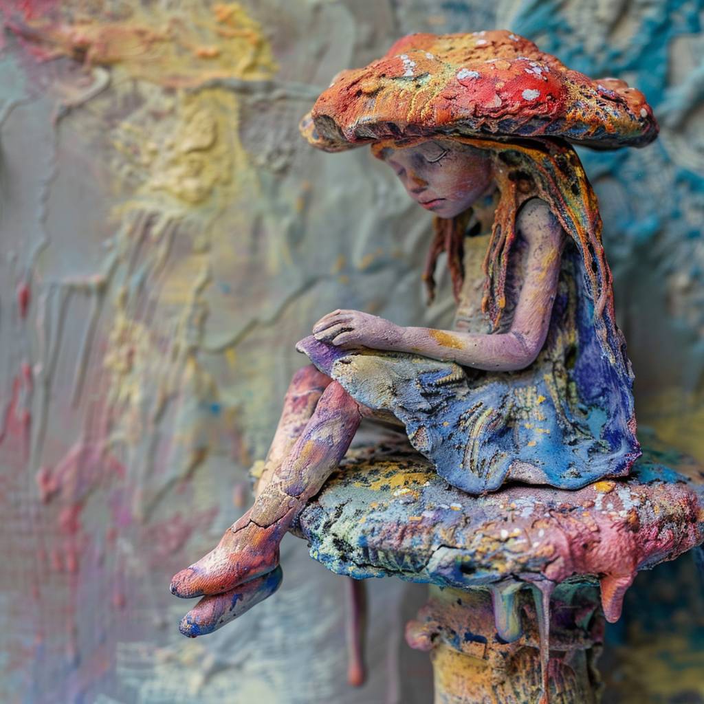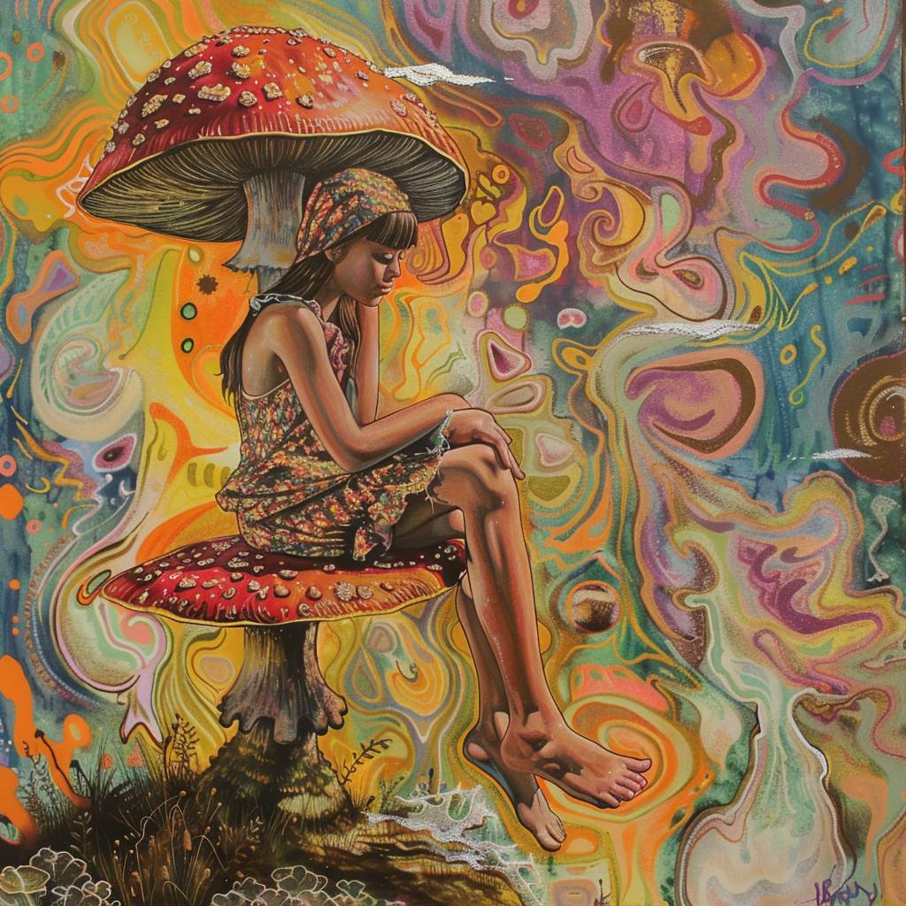 Elfe sitzt auf einem Pilz, fantasievoller Traum.