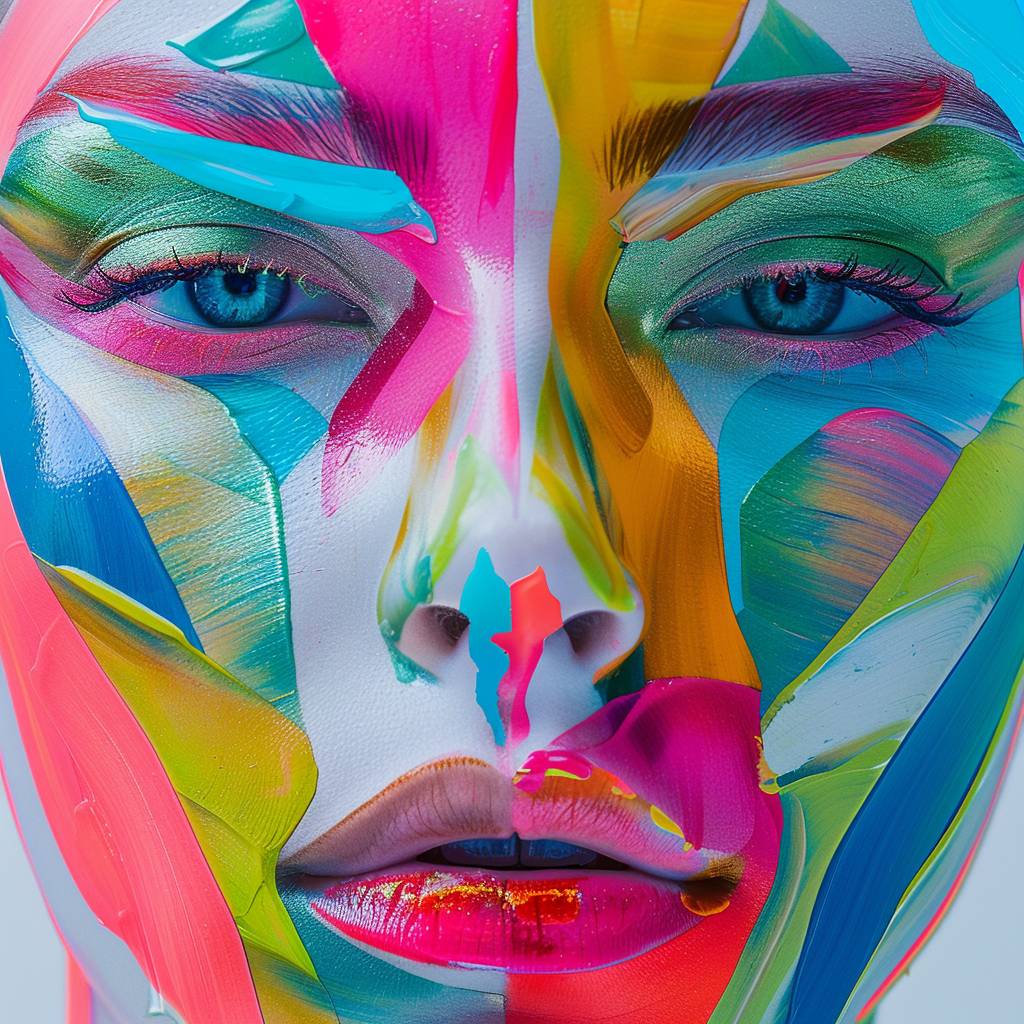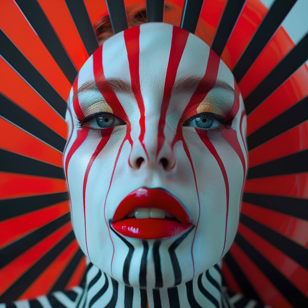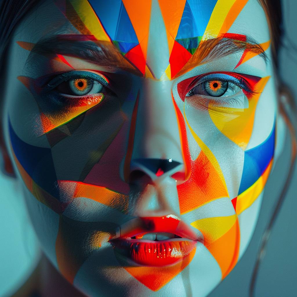 bold and beautiful Close-up, portrait photo, face paint, porcelain doll, vertical glitch art, sacred geometry, vivid colors, symmetrical, minimalism --v 6.0