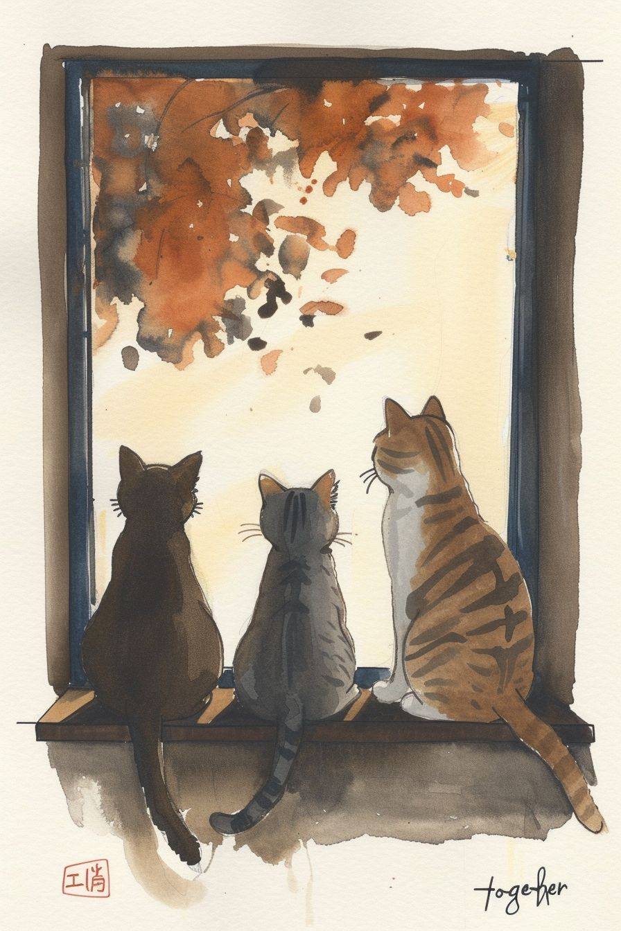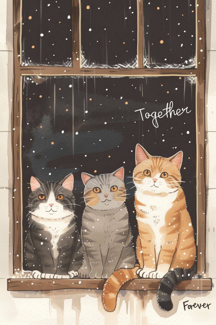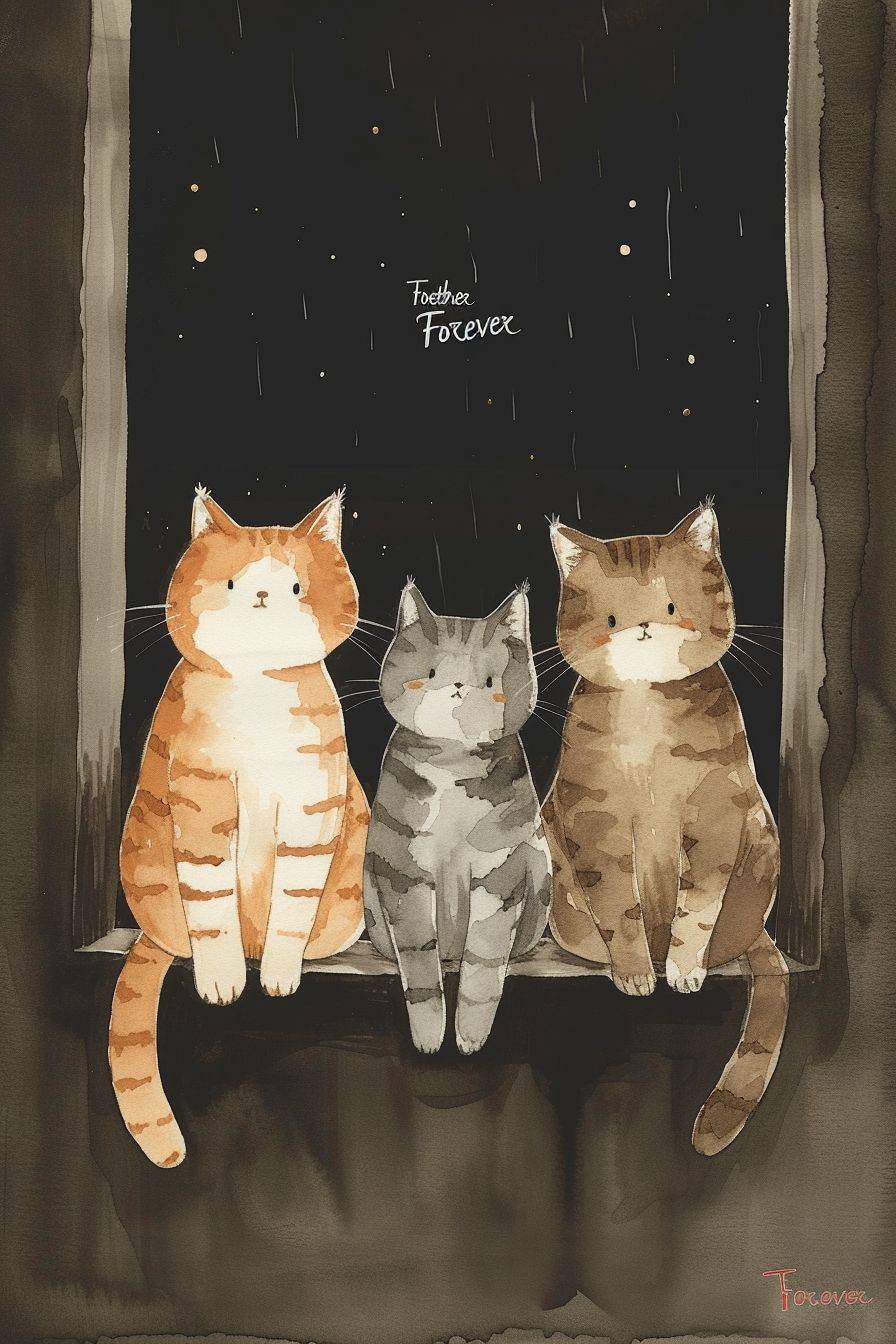 3 cats sitting together on a window ledge, first cat on the right is brown tabby, the cat in the middle is a grey tabby, the 3rd cat is grey with white paws,on shimmering dark amber white surface, charming yet childishly simple minimalistic storybook style, referential stippling art, Kiichi Okamoto, Tomoyoshi Murayama, gouache brushwork mixed with grainy woodblock print, playful hand-drawn gesture, abstract hatching lines and detail, kawaii chibi ukiyo-e, bold pop art aesthetic, vibrant colors, handwritten title "Together Forever", --ar 2:3 --v 6