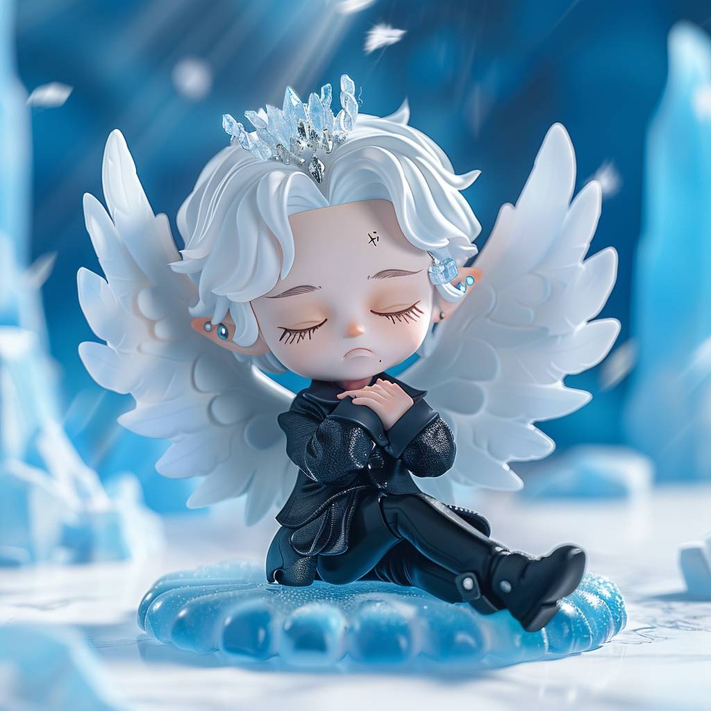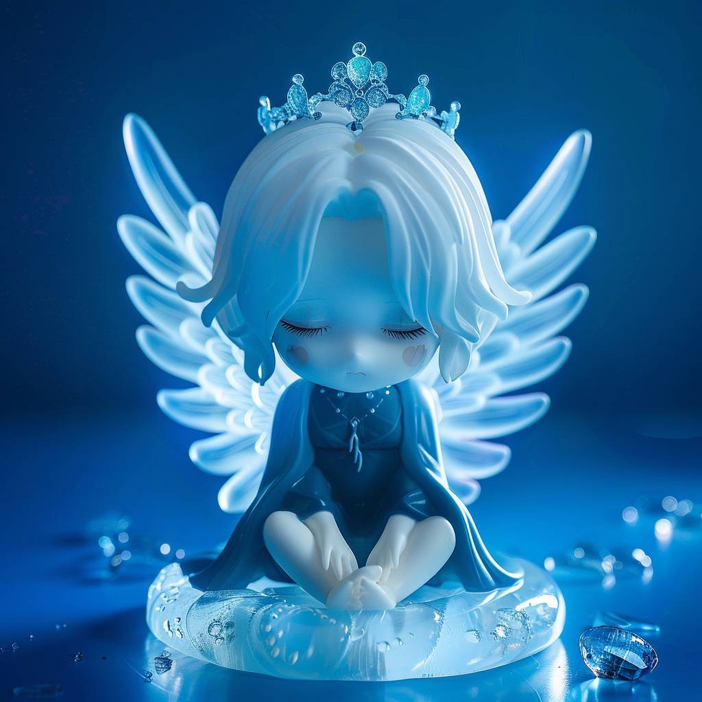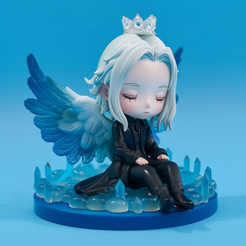 IP von Pop Mart, Blindbox-Spielzeuge, 1 Mädchen, blaue Augen, Vampire, ein Auge geschlossen, weiße Haare, mit einer Kristallkrone auf dem Kopf, auf Gelee sitzend, Engel, Kristallflügel, blauer Edelstein, blauer Hintergrund, sitzend, beste Qualität, sehr ästhetisch, 8k, ohne Text.