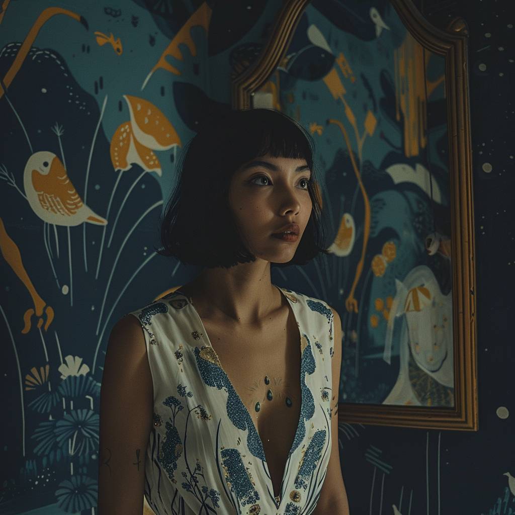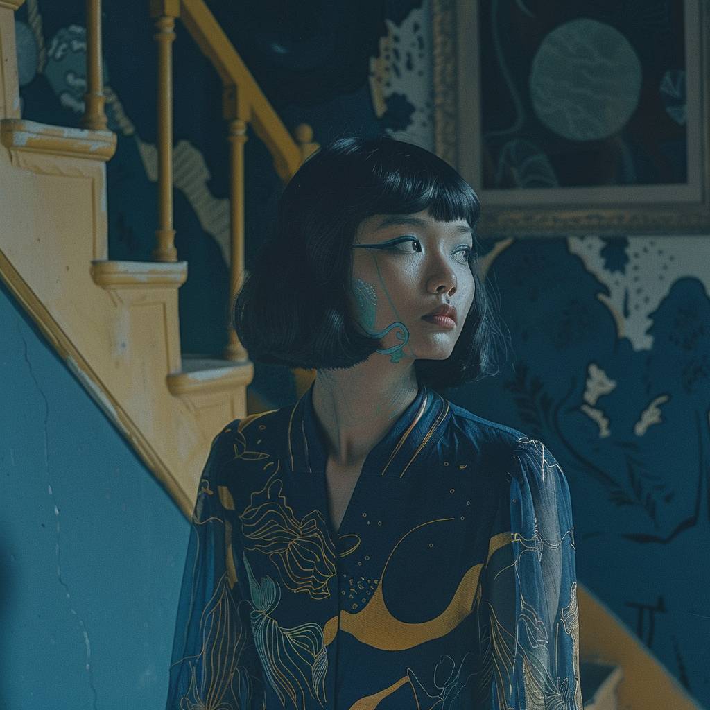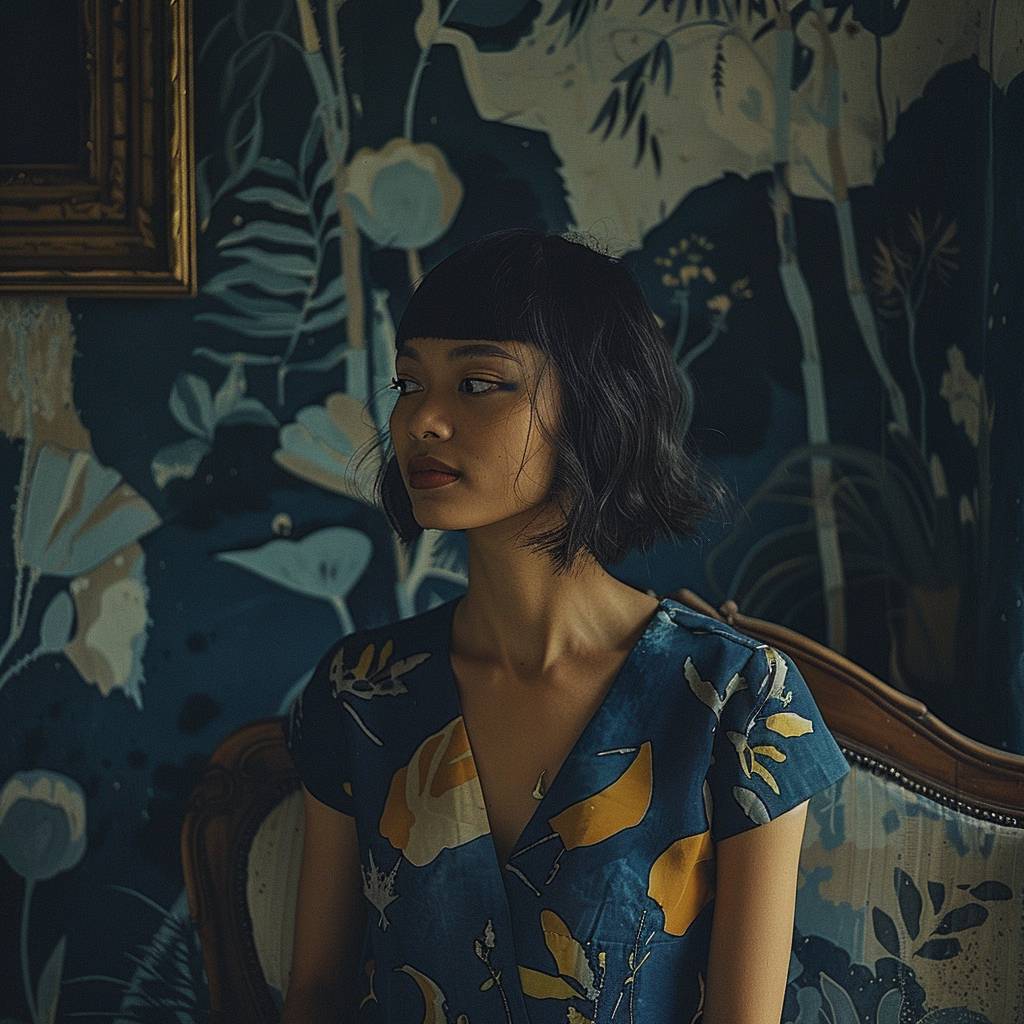 Analoge Fotografie, Vintage-Modenshooting in einem alten Herrenhaus, Modell aus Südostasien mit schulterlangem, rasiermesserscharf geschnittenem Bob-Haarschnitt, spät am Morgen, sanftes natürliches Licht, Porträtwinkel, lebendige, gesättigte Farbpalette, Vintage-Effekt der 70er Jahre, subtile Surrealität, aufgenommen auf 35 mm Film, traumhafte und nostalgische Komposition