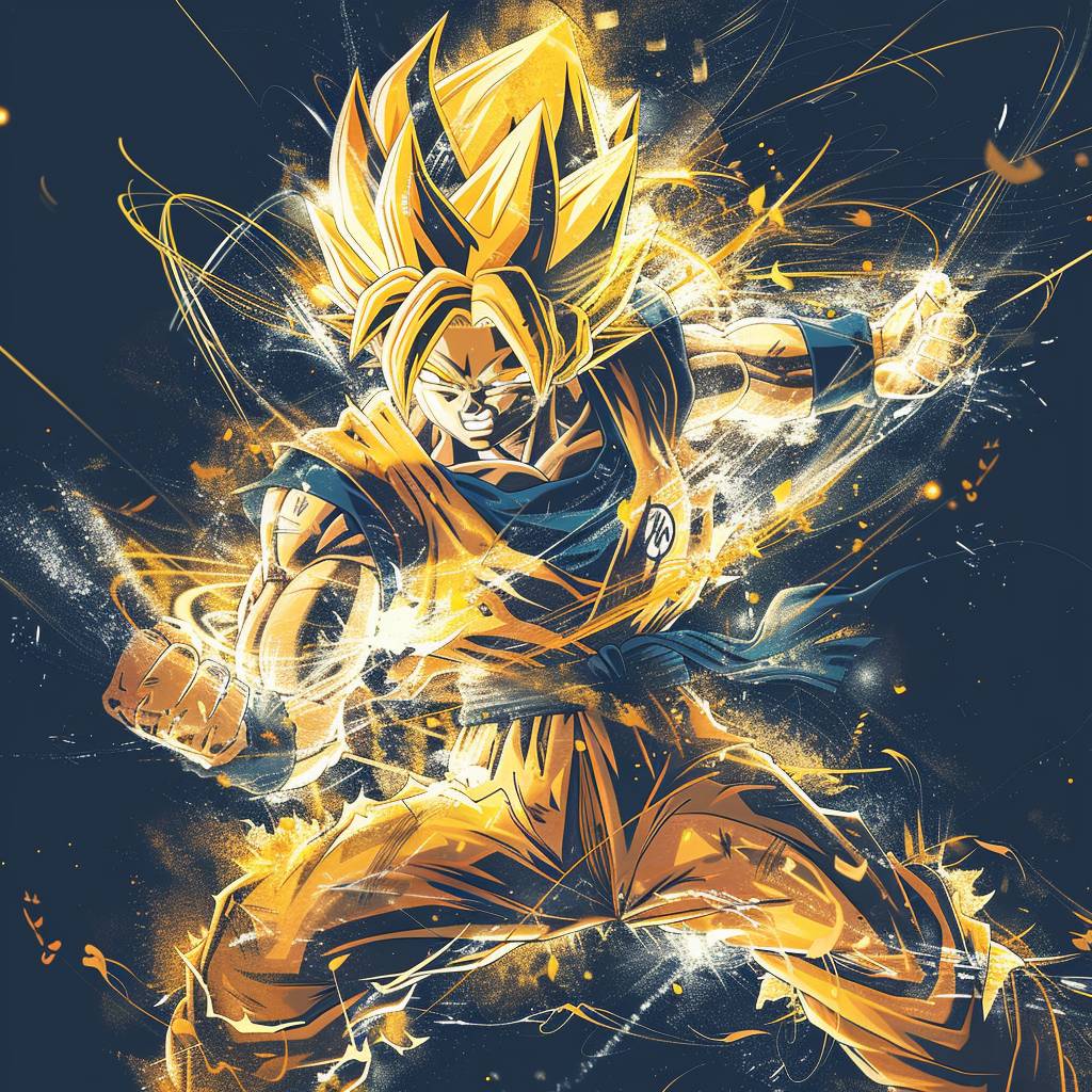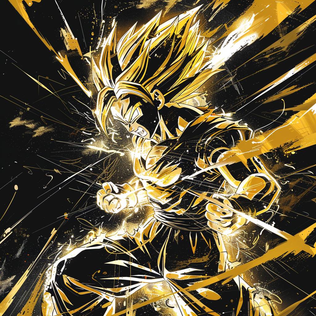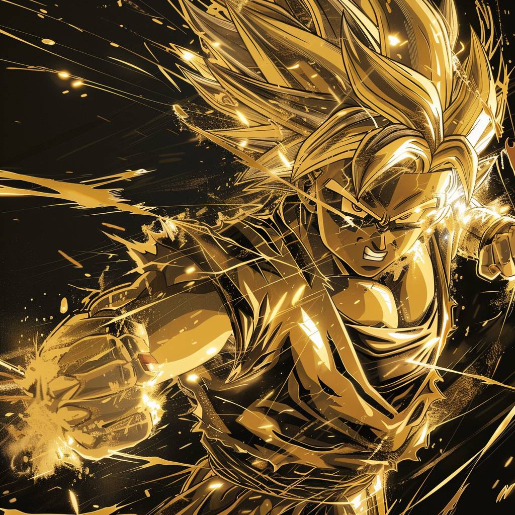Super Saiyan Goku aus Dragon Ball in einer Actionpose, im Vektor-Art-Stil und mit einem gold-schwarzen Farbschema, dramatischer Beleuchtung, detaillierten Hintergrundelementen, einem dynamischen Winkel, fetten Linien, hohem Kontrast, Anime-Kunst, hoher Auflösung, hoher Detailgenauigkeit, lebendigen Farben, einer energetischen Atmosphäre.