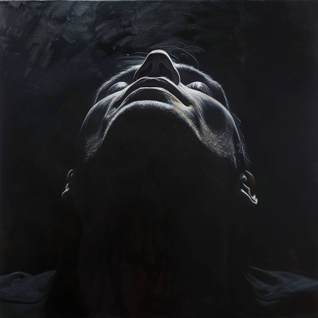 Ein dramatisches hyper-realistisches Ölgemälde, das einen starken Kontrast zwischen Licht und Dunkelheit zeigt.