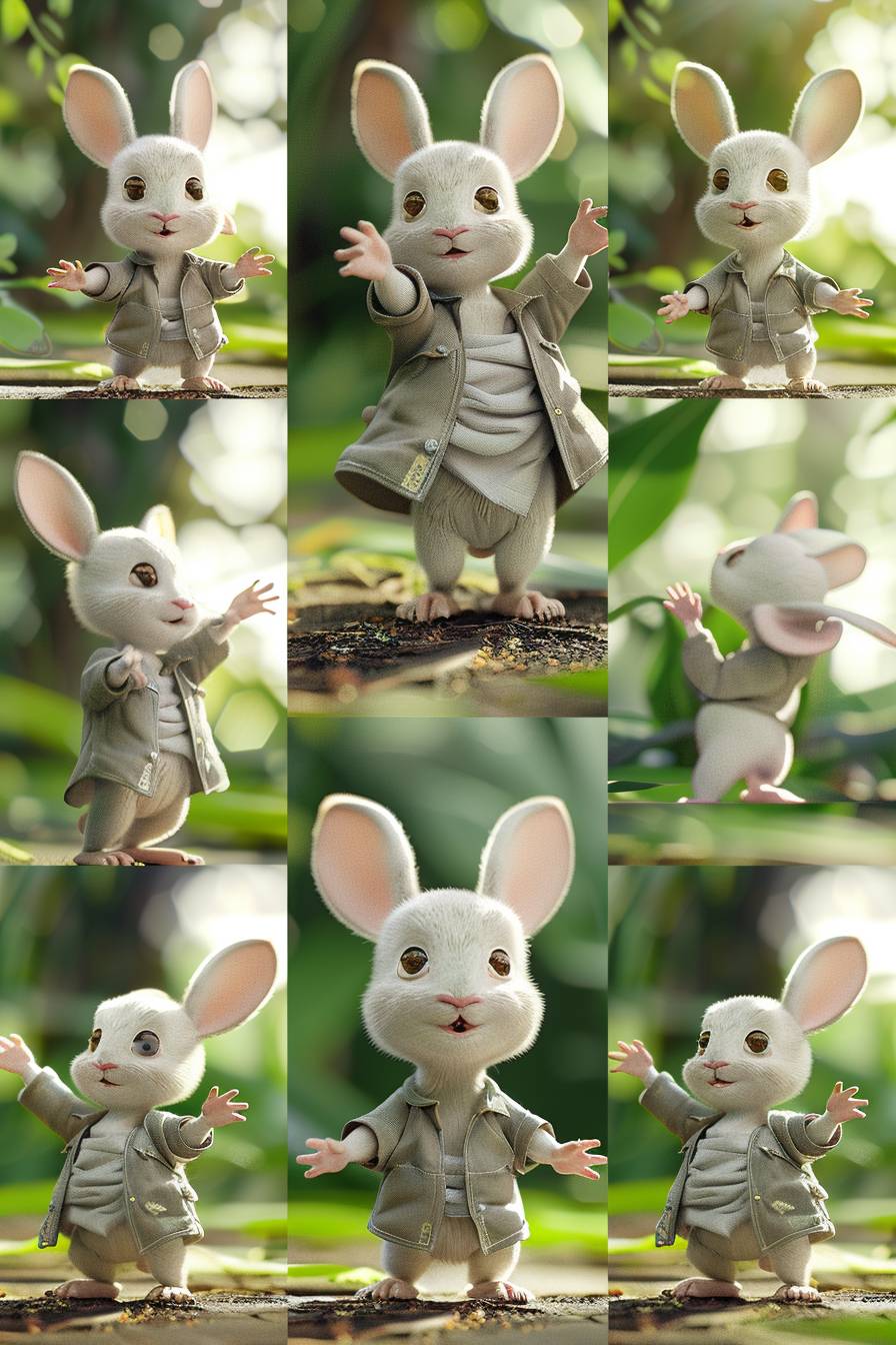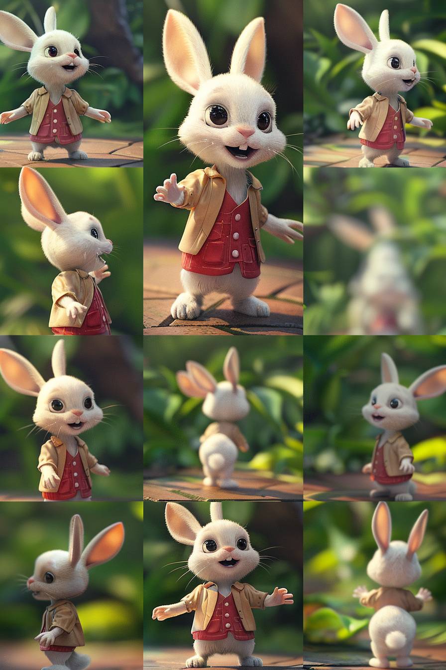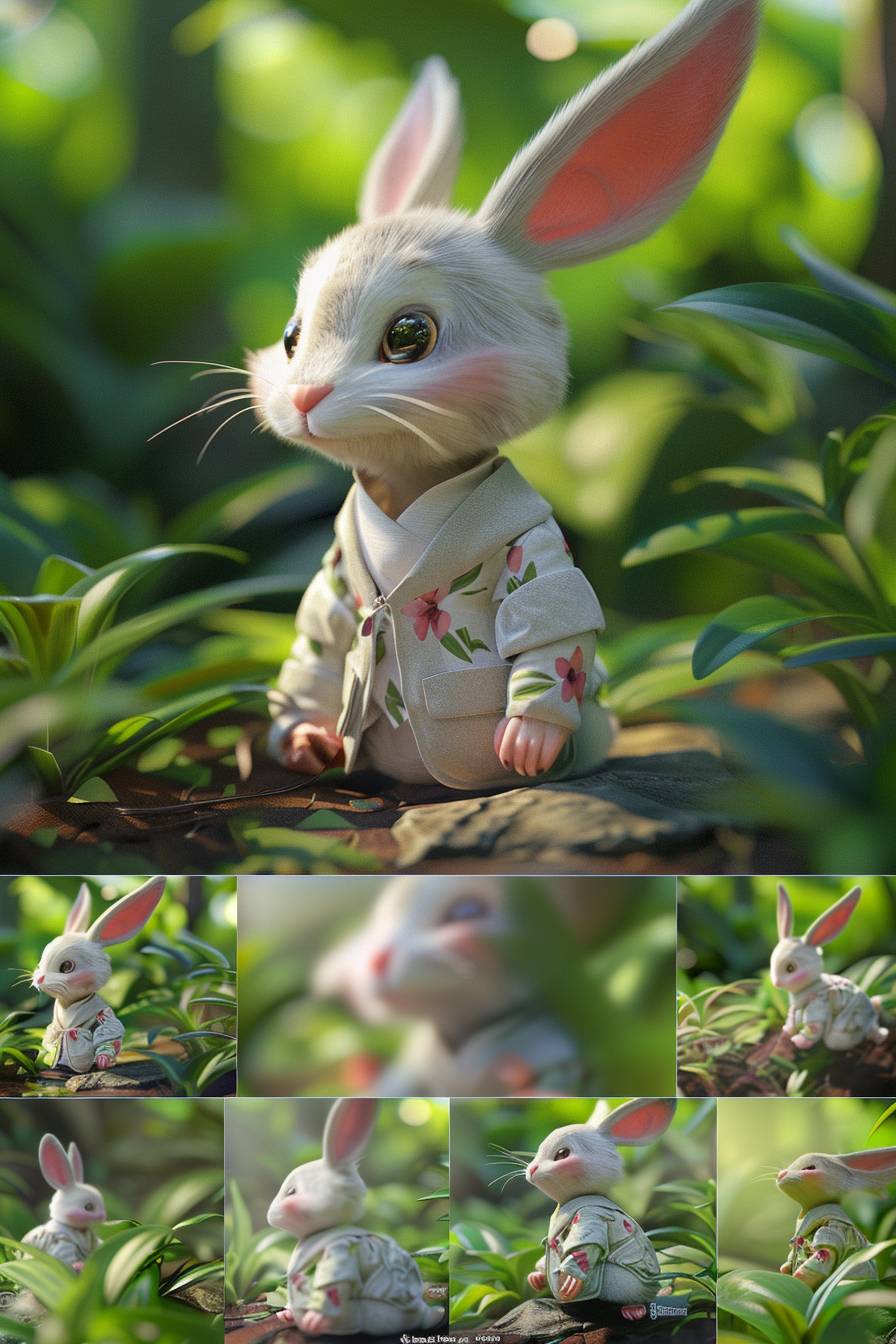 Cartoon 3D image, An anthropomorphic cute little white rabbit, wearing clothes, The background is the jungle, Divided into 9 different images, Shooting from multiple angles, 3d, Unreal Engine --ar 2:3 --v 6.0