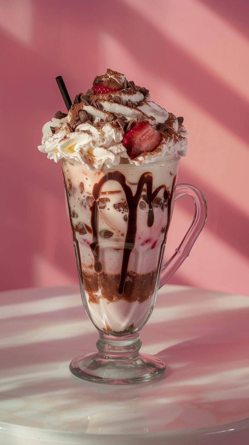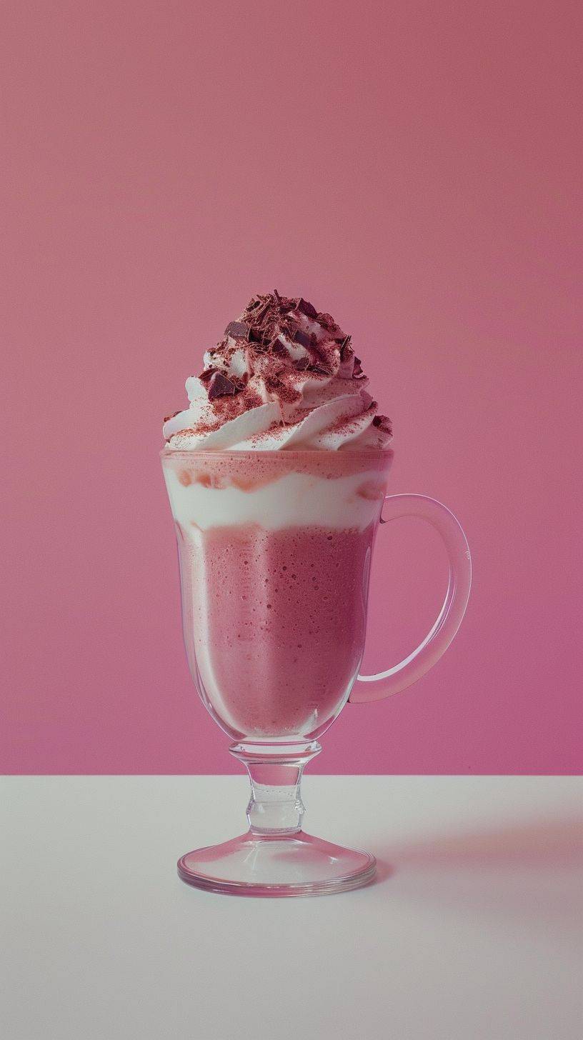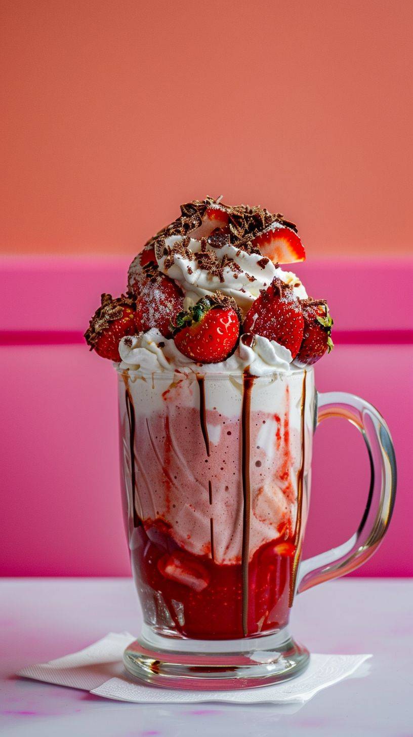 Strawberry smoothie topped with whipped cream and chocolate served on a glass mug on top of a white table and a pink wall in the background by Nikon D7000, centered, perfect composition --ar 9:16 --v 6