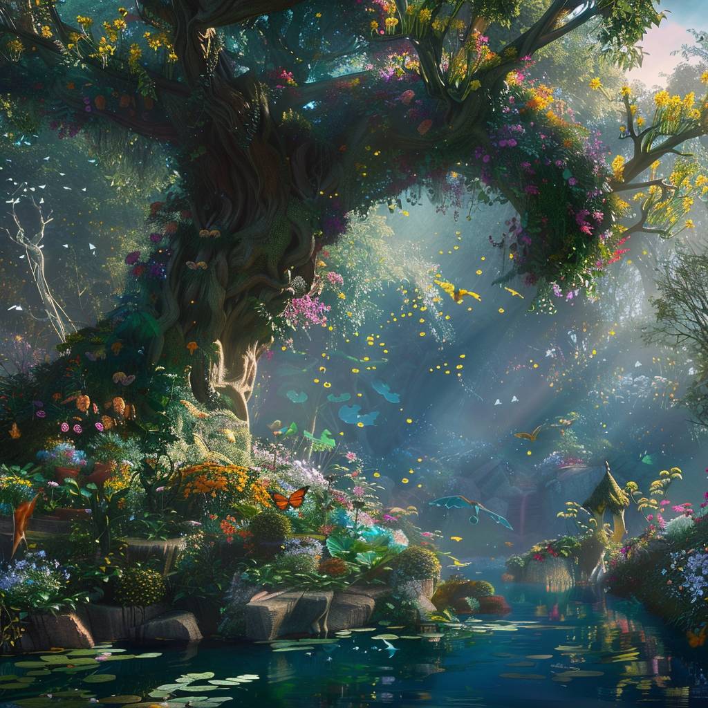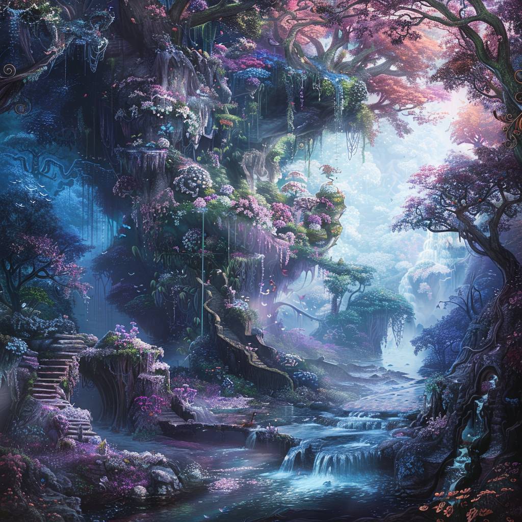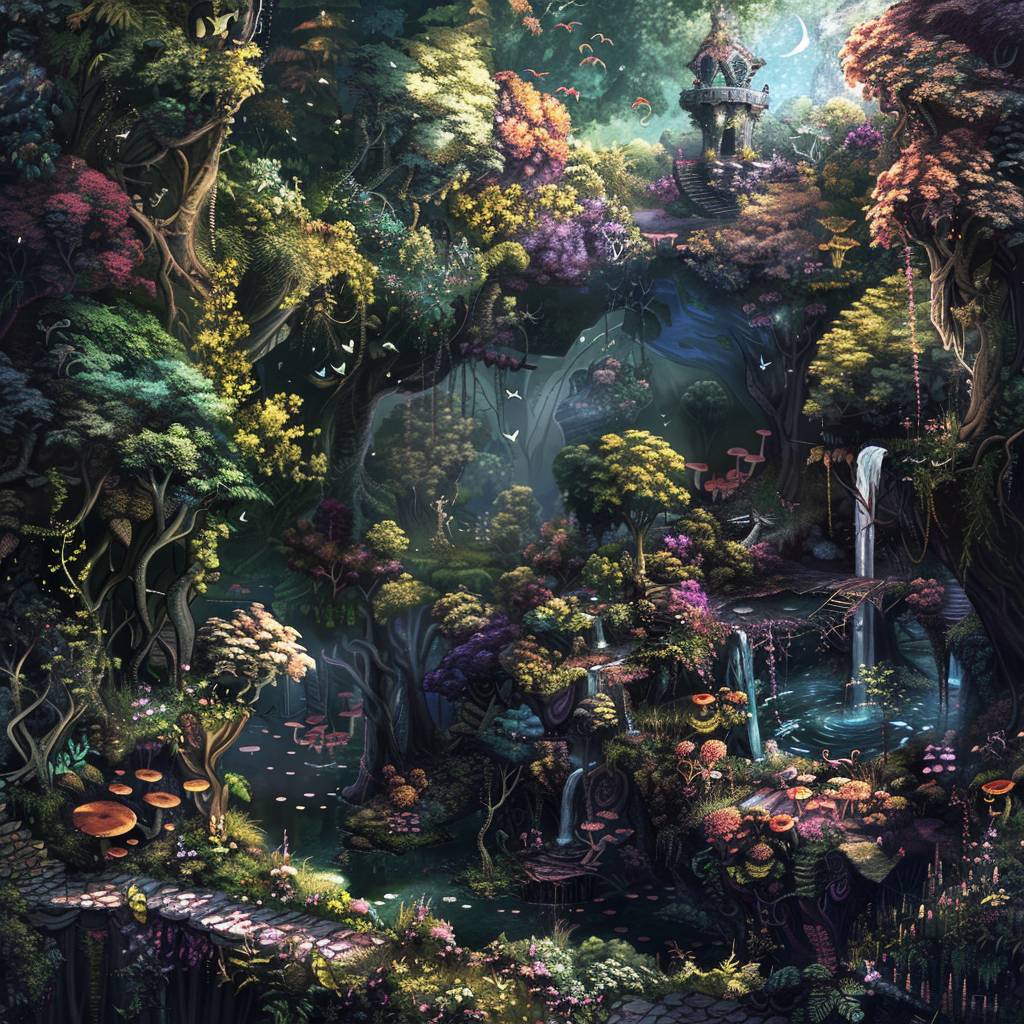 Erforschen Sie das 'Verzauberte Refugium', ein verborgenes Heiligtum, in dem farbenfrohe Flora und Fauna in perfekter Harmonie koexistieren und ein magisches Reich schaffen, das von der Zeit unberührt bleibt.