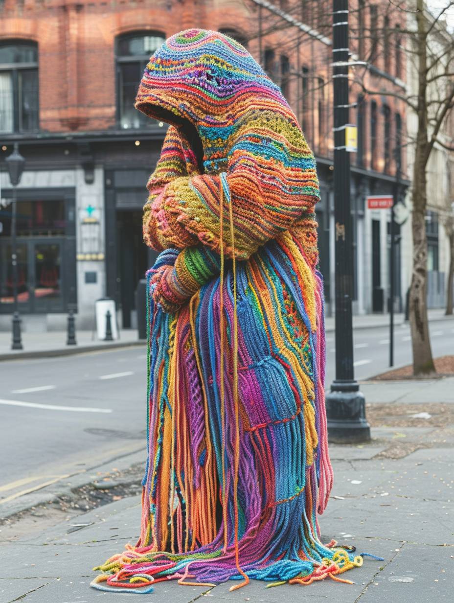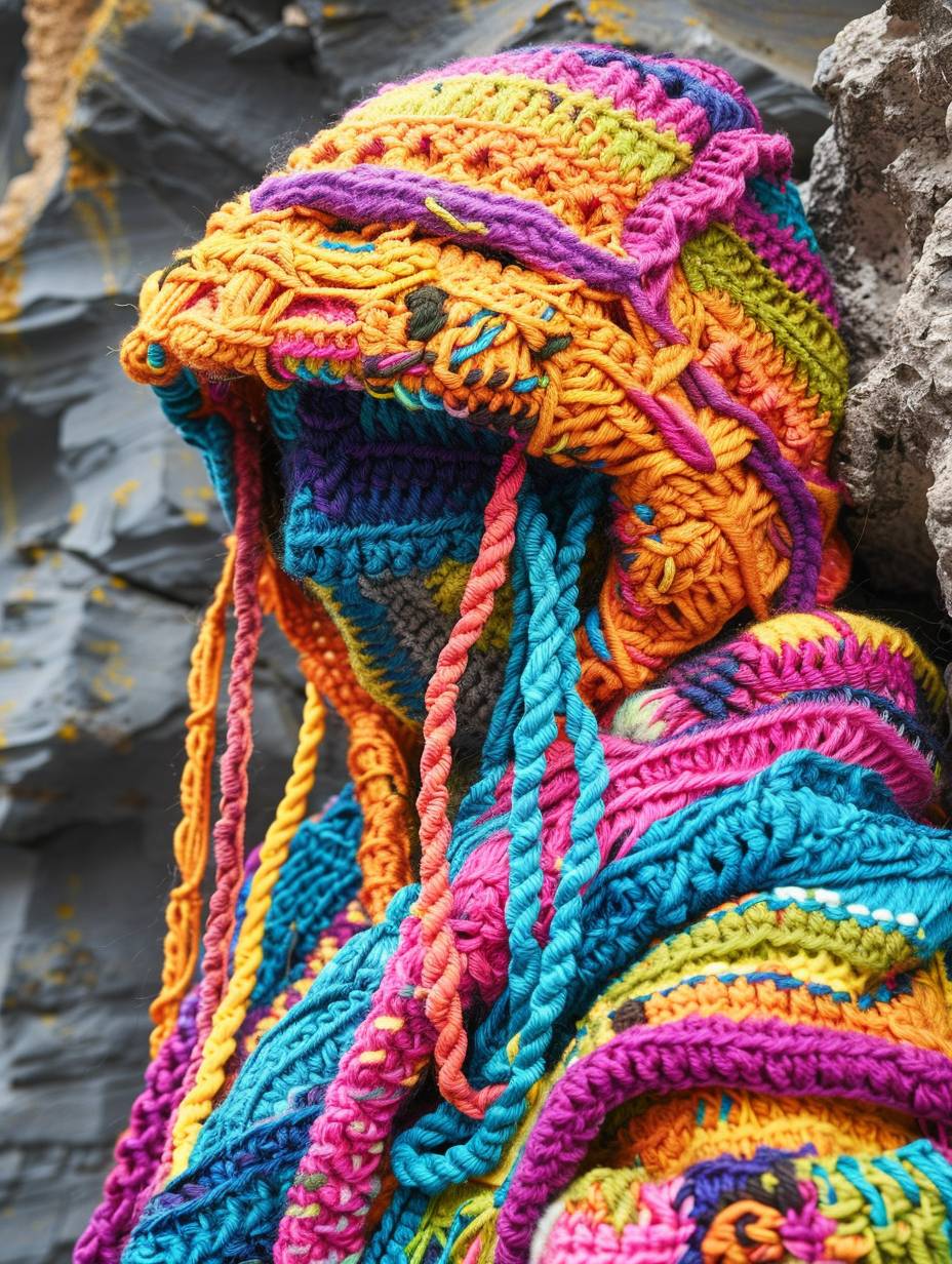 Bunt gehäkelte Wolle im Stil des Yarn Bombing.