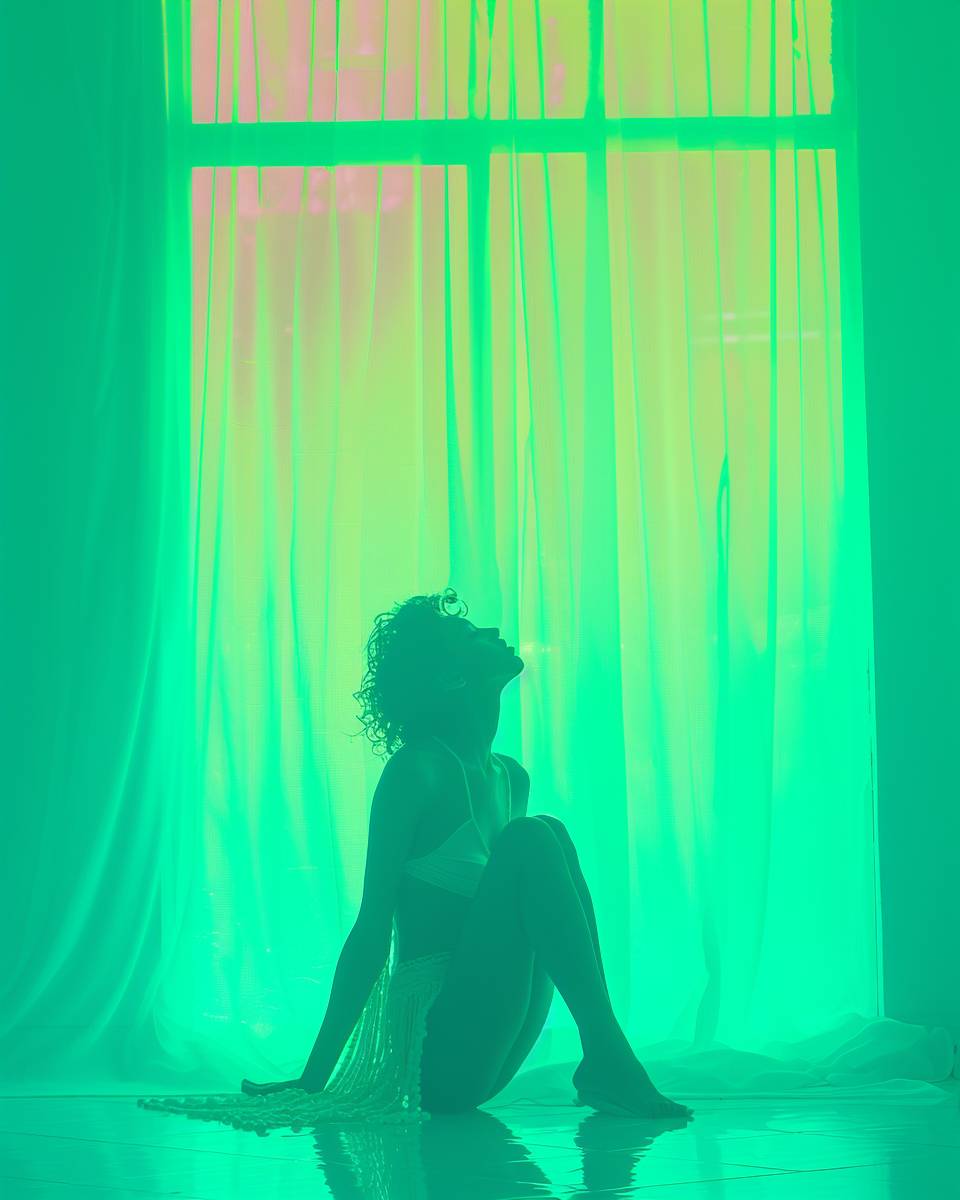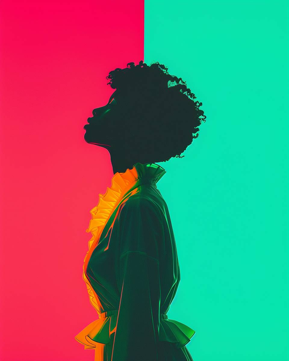 Neon Shadows: Dimmed lights, striking poses. Colorful silhouettes: Green and orange tones, fashion flair. --ar 4:5 --stylize 1000 --p b1oftln --v 6.0
