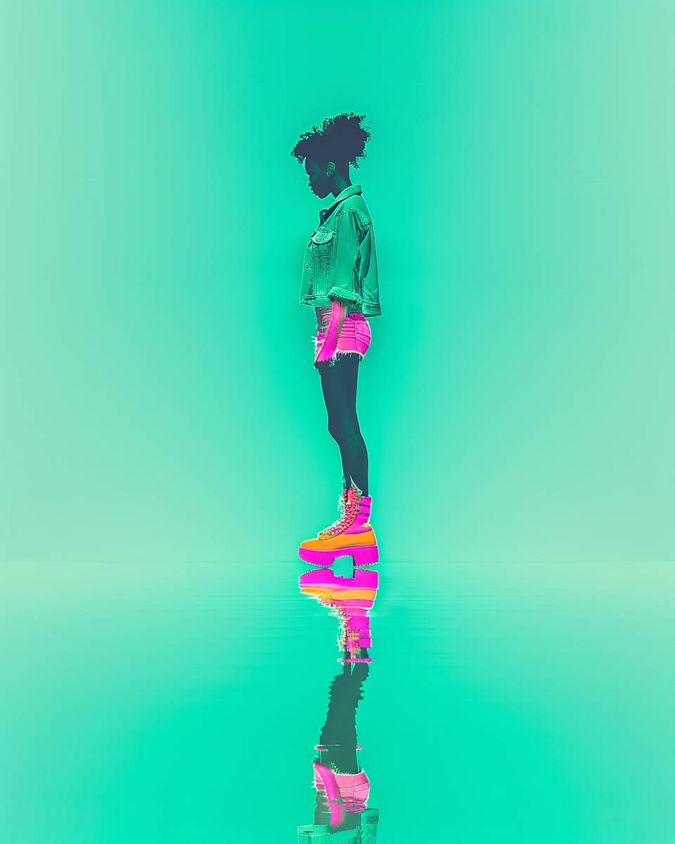 Neon-Schatten: Gedimmtes Licht, auffällige Posen. Bunte Silhouetten: Grüne und orangefarbene Töne, modischer Flair.