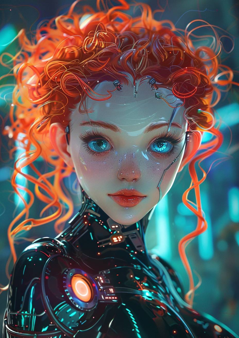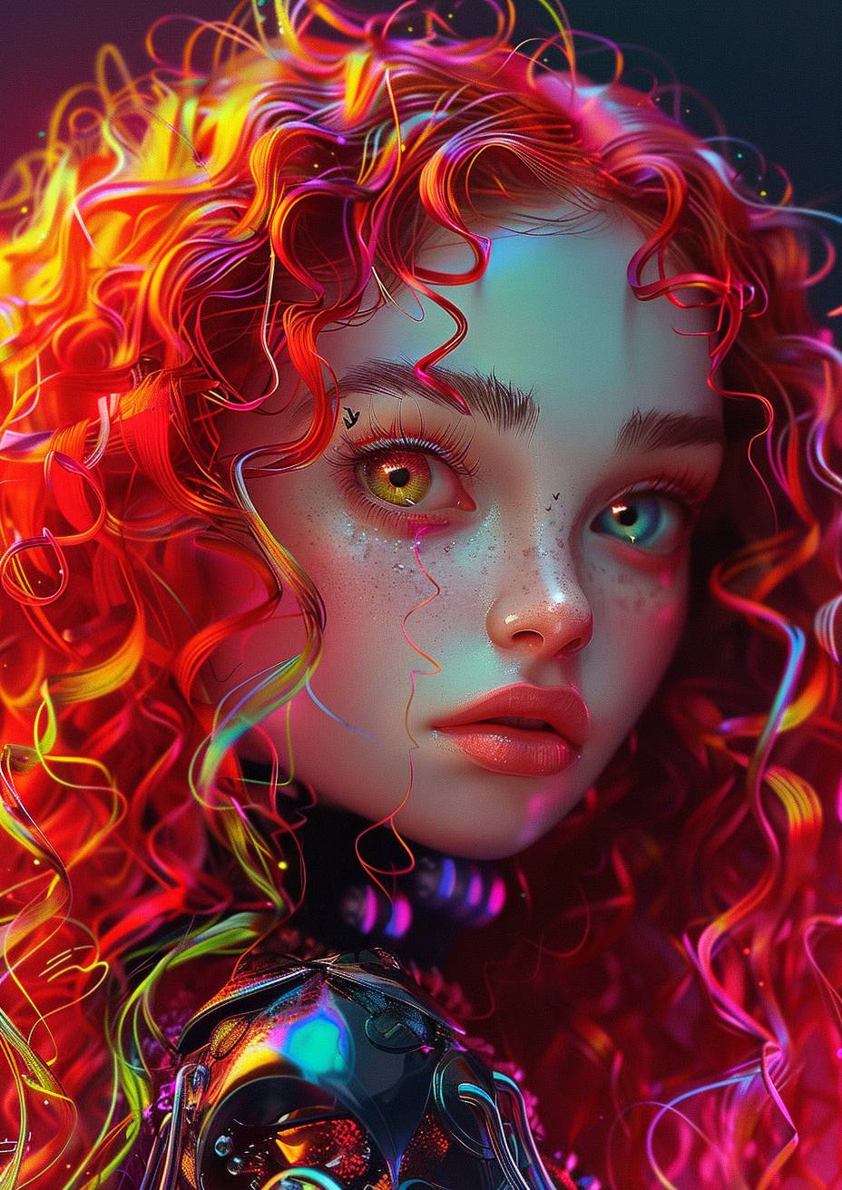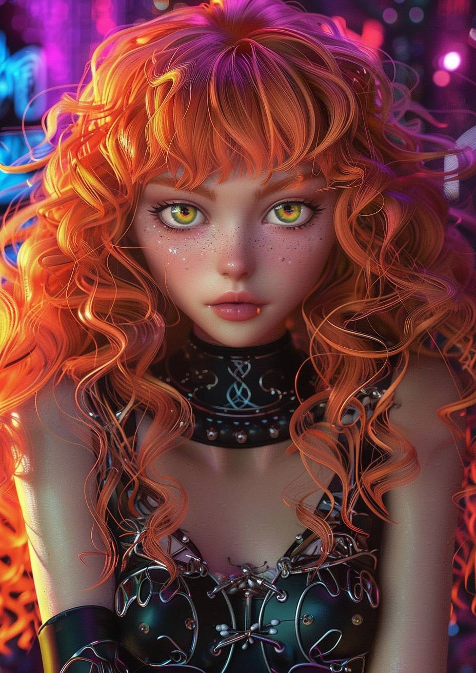 Ein psychedelisches, lockiges, rothaariges Mädchen in einem metallischen Overall, sie hat große Augen und lange Wimpern, Fantasiekunststil, detaillierter Anime-Stil, Ganzkörperaufnahme, hyperrealistisch, digitale Malerei, lebendige Farben, trendige Farbpalette.
