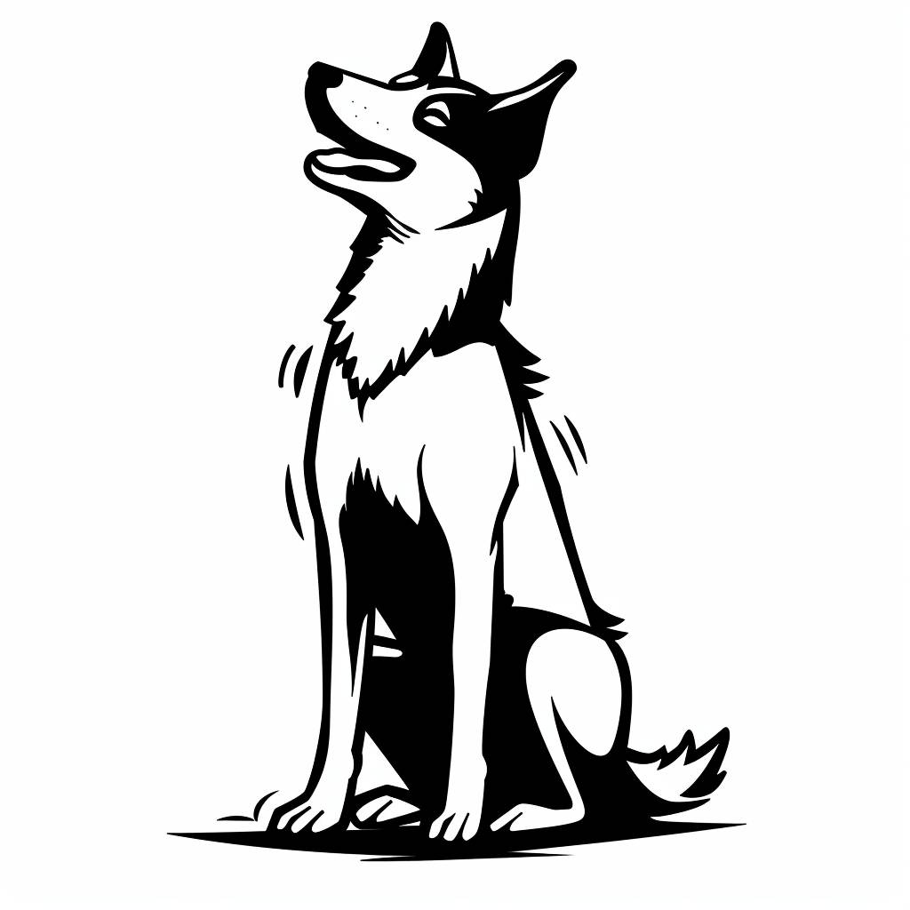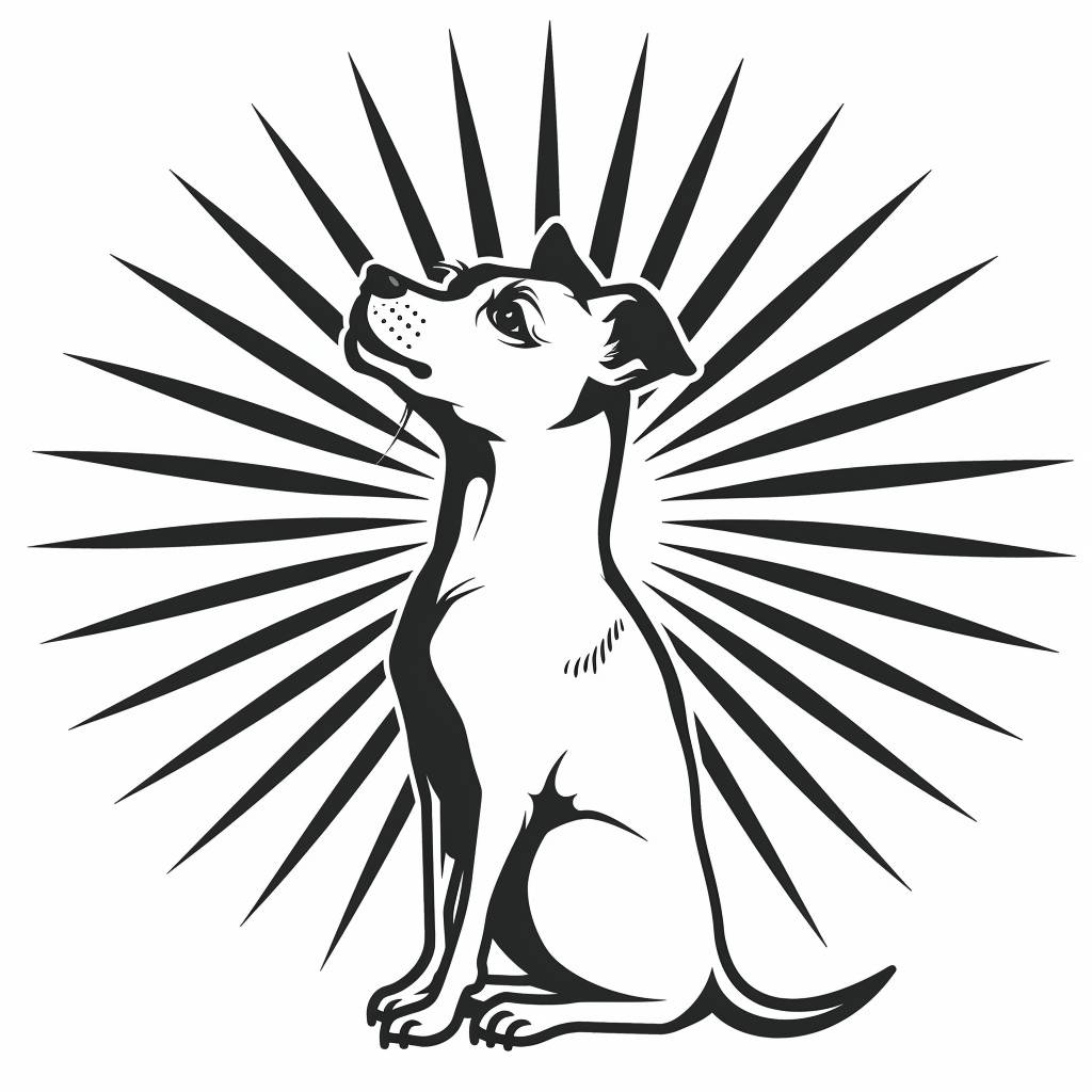 Ein Logo für ein hundebezogenes Unternehmen im Stil des Atomic Age der 1950er Jahre, einfaches Liniendesign in Schwarz auf Weiß. Das Bild ist fröhlich und einladend. Es zeigt einen Hund.