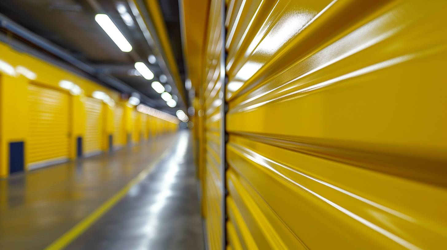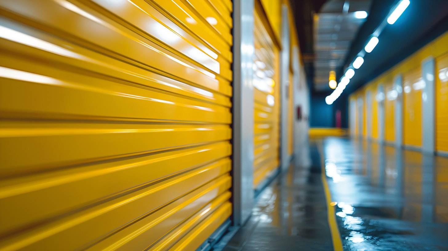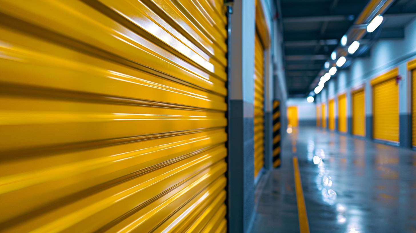 detail photography of a brand-new yellow storage door, underground, angled view, uhd, detailed, selective focus --ar 16:9 --style raw --stylize 250 --v 6.0