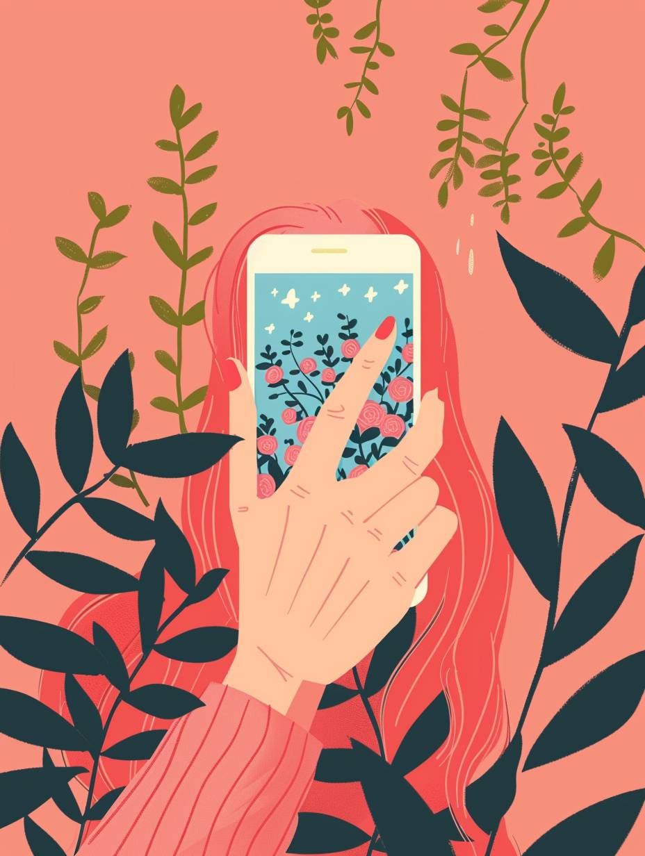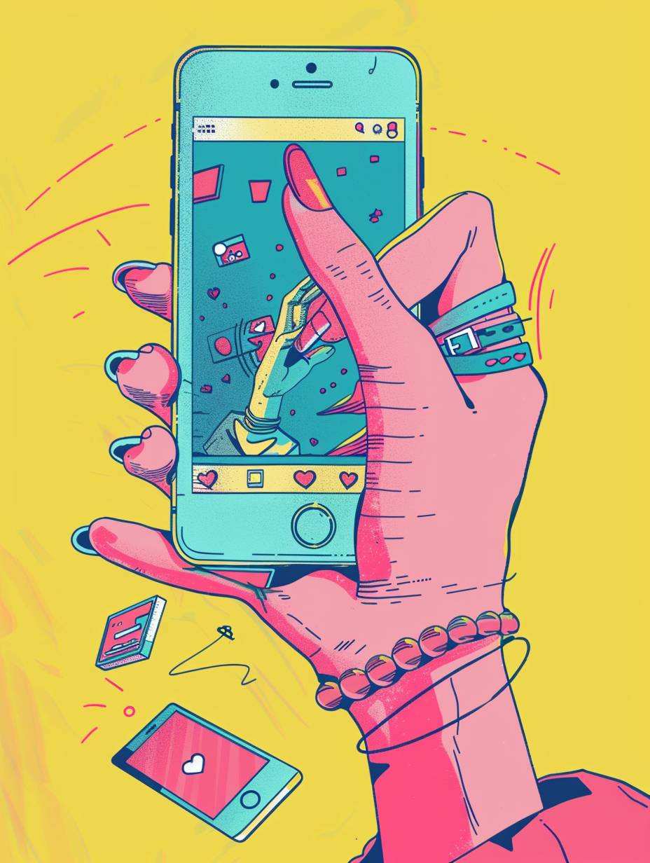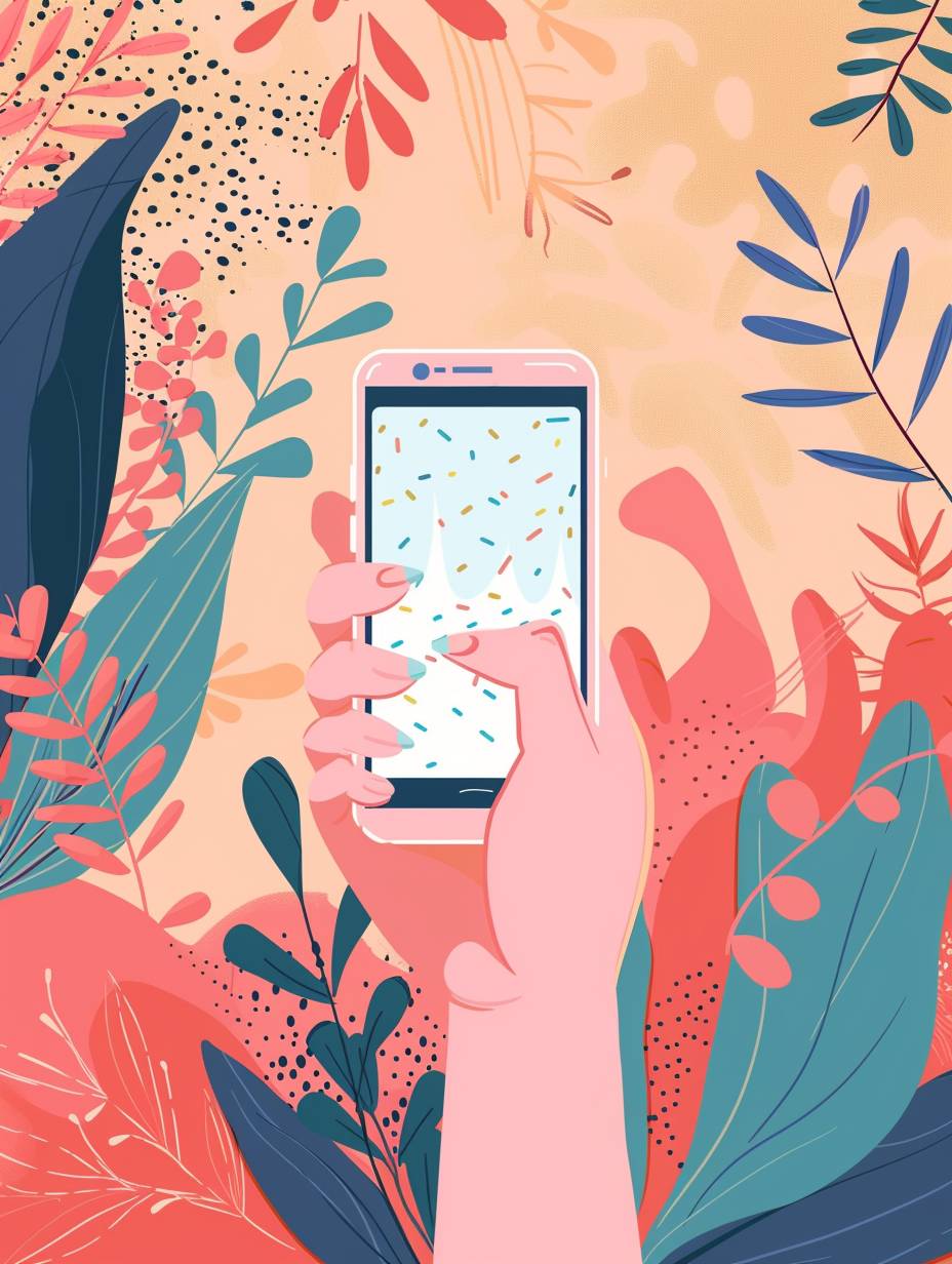 Illustration einer weiblichen Hand, die ein Telefon hält und in sozialen Medien scrollt