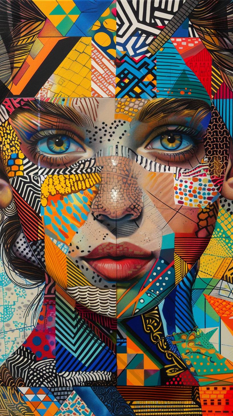 A young woman's portrait is crafted using intricate line work, geometric patterns, and vibrant colors, resulting in a visually striking and often abstract composition. --ar 9:16 --v 6.0