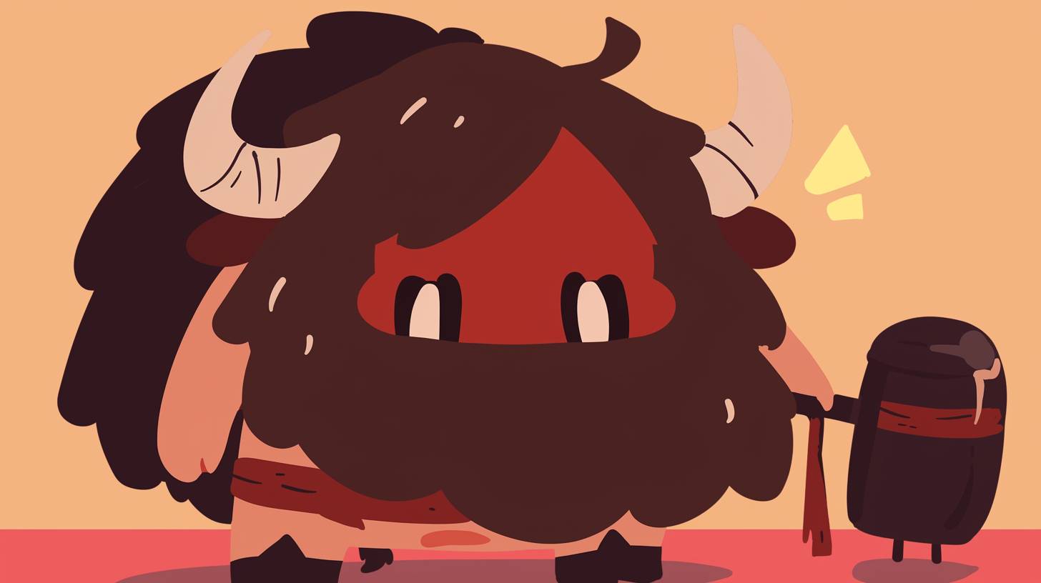 Eine einfache Zeichnung des Minotaurus im Stil von Allie Brosh mit einfachen Linien, flachen Farben und einer Strichfigur, minimalistisch, einfacher Hintergrund.