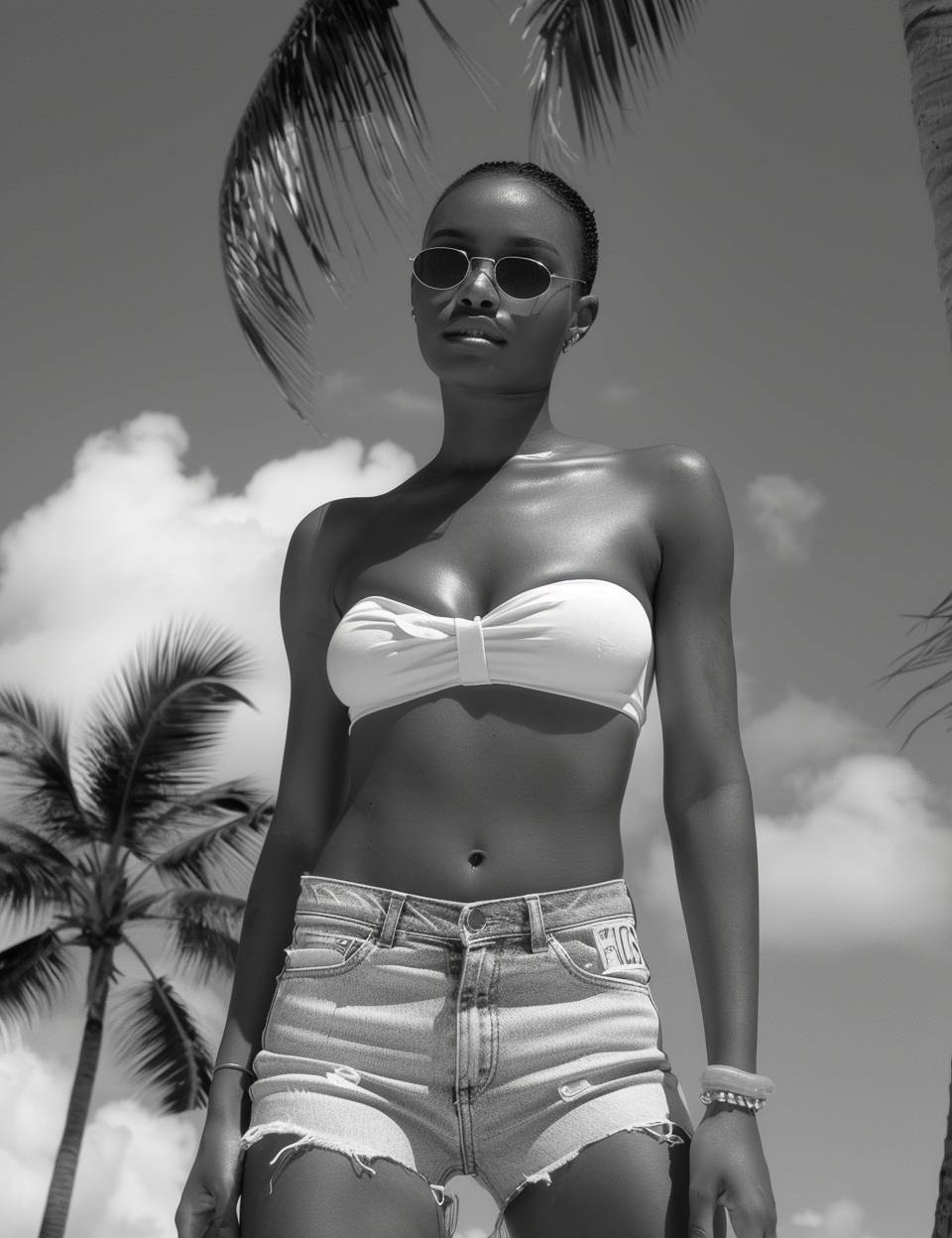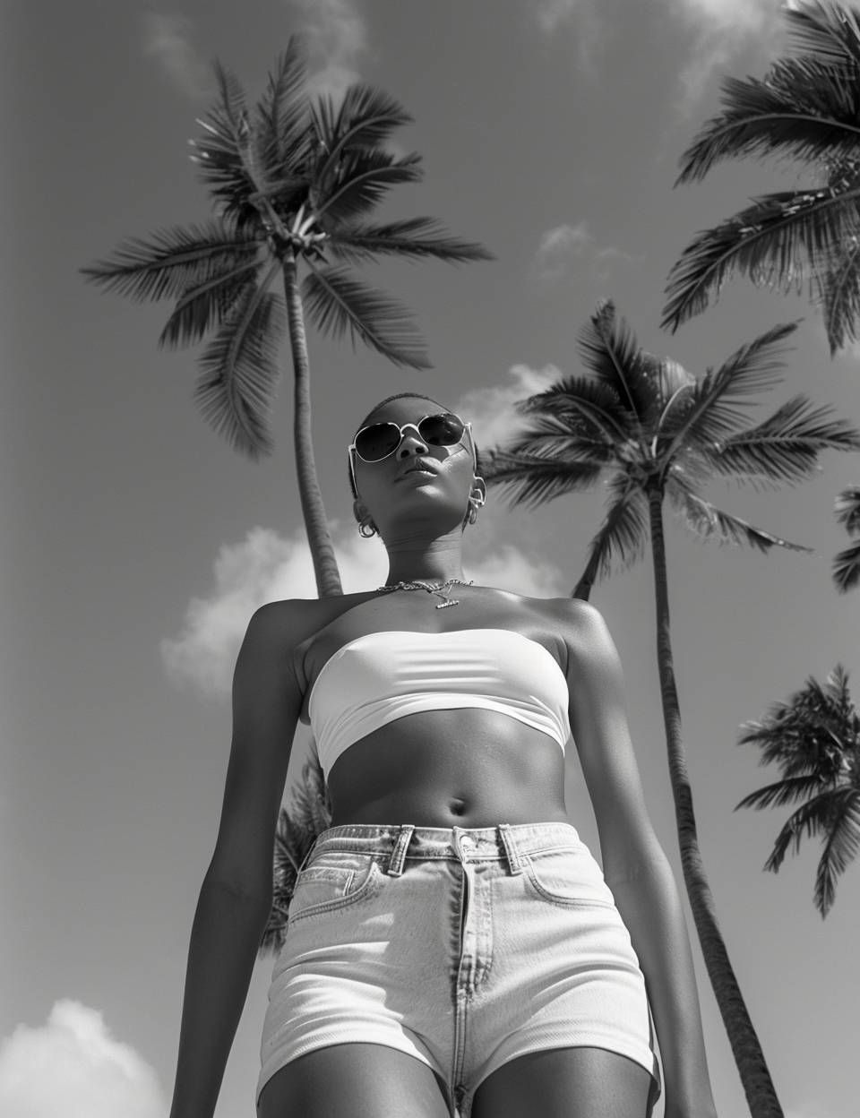 Impudent summer fashion. Very Low angle black and white photo of an African woman wearing denim shorts and sunglasses, standing in the middle of palm trees on a tropical island, sky background, low-angle shot, dynamic pose, natural lighting, full body shot. --ar 17:22 --style raw --s 500 --p 7myp5x5 --v 6.0