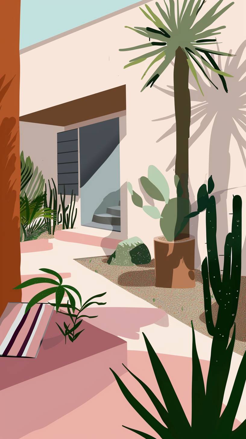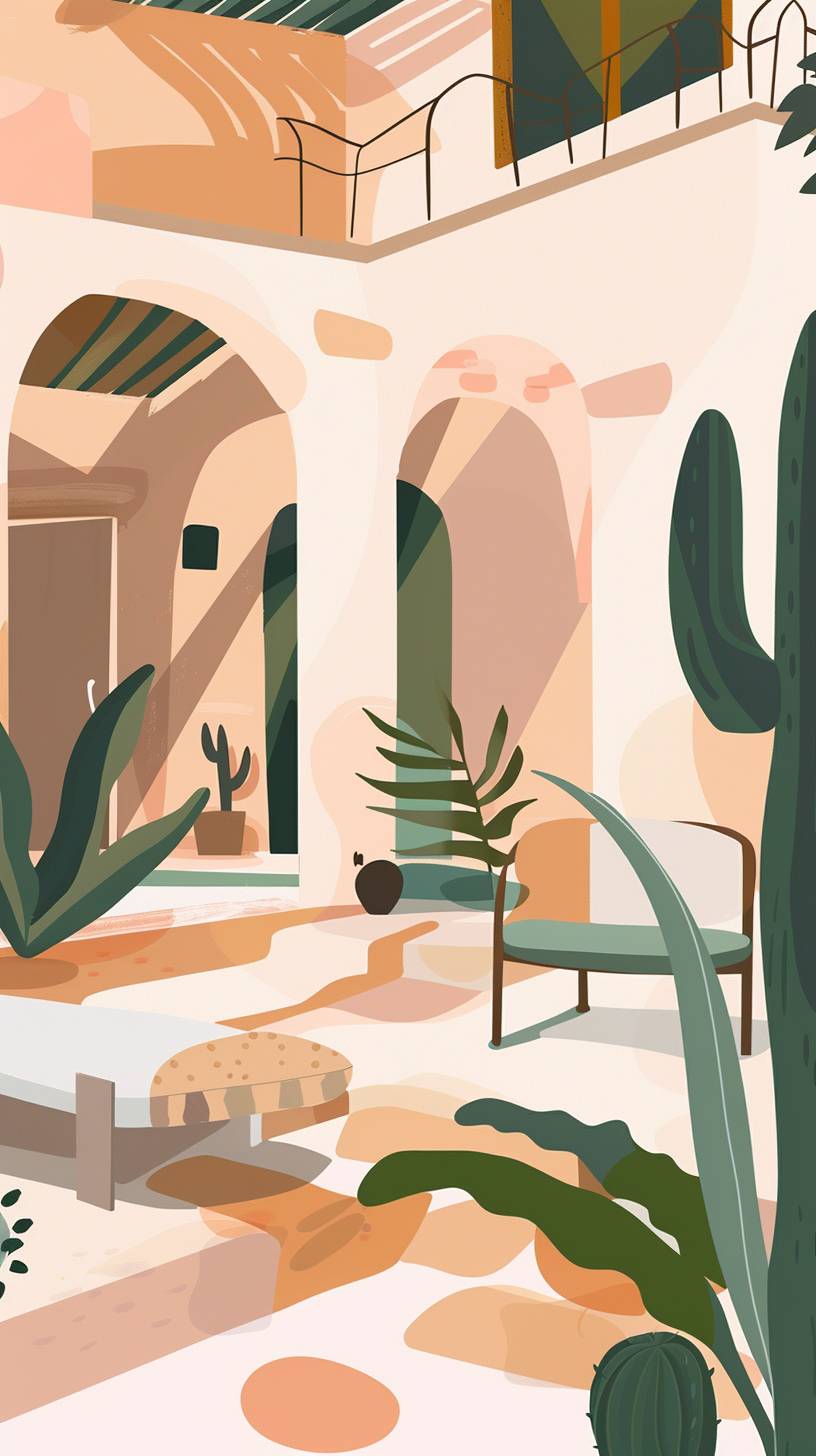 desert courtyard. Mid century boho architecture art print, wall décor social media stories contemporary style. Vector illustration --ar 9:16 --style raw --stylize 0 --v 6.0