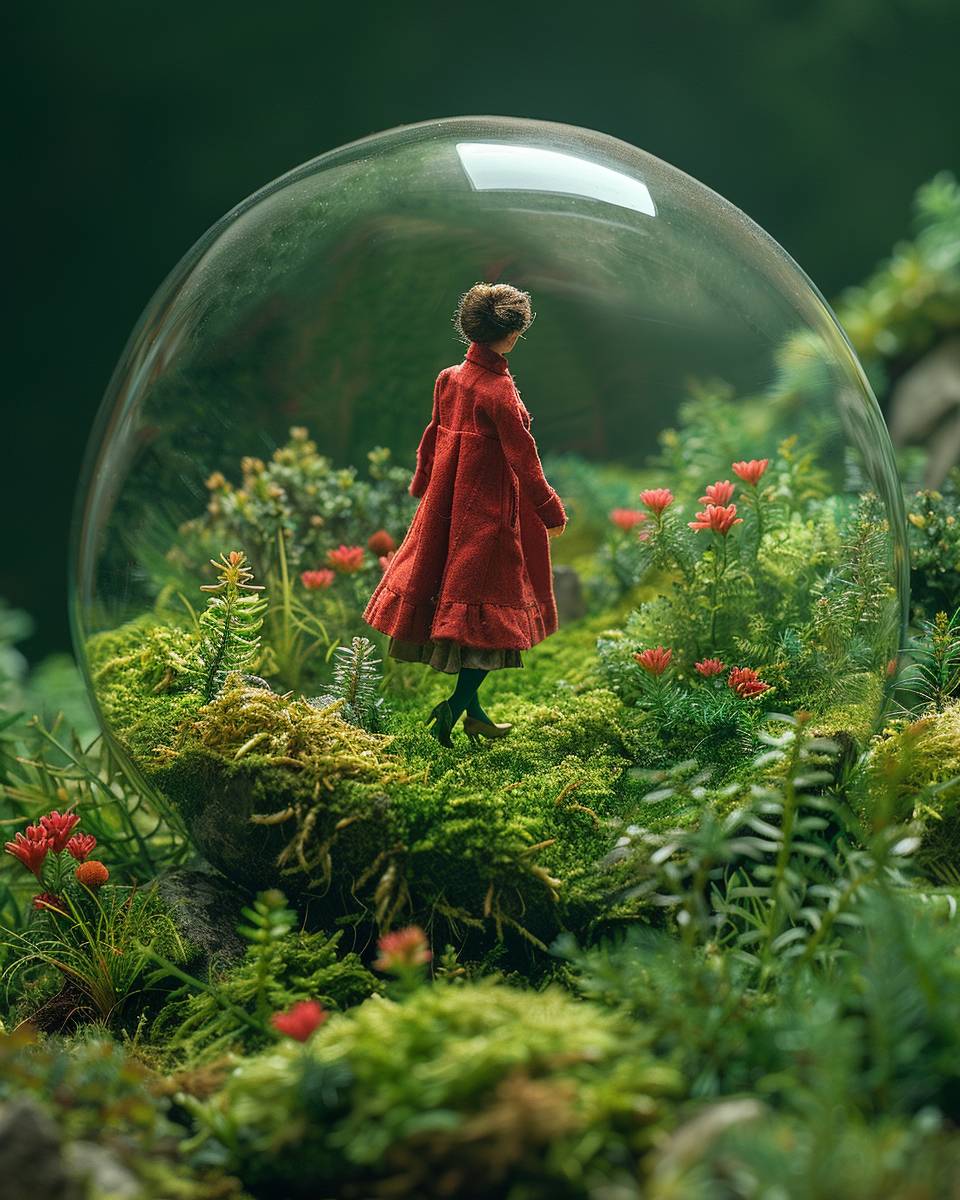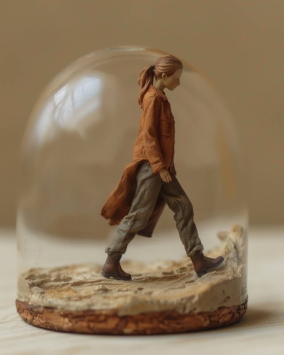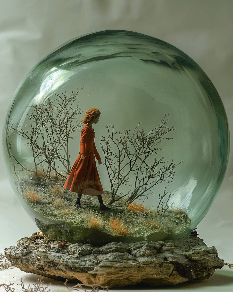 Eine Miniaturfrau geht in einer riesigen Glasglocke