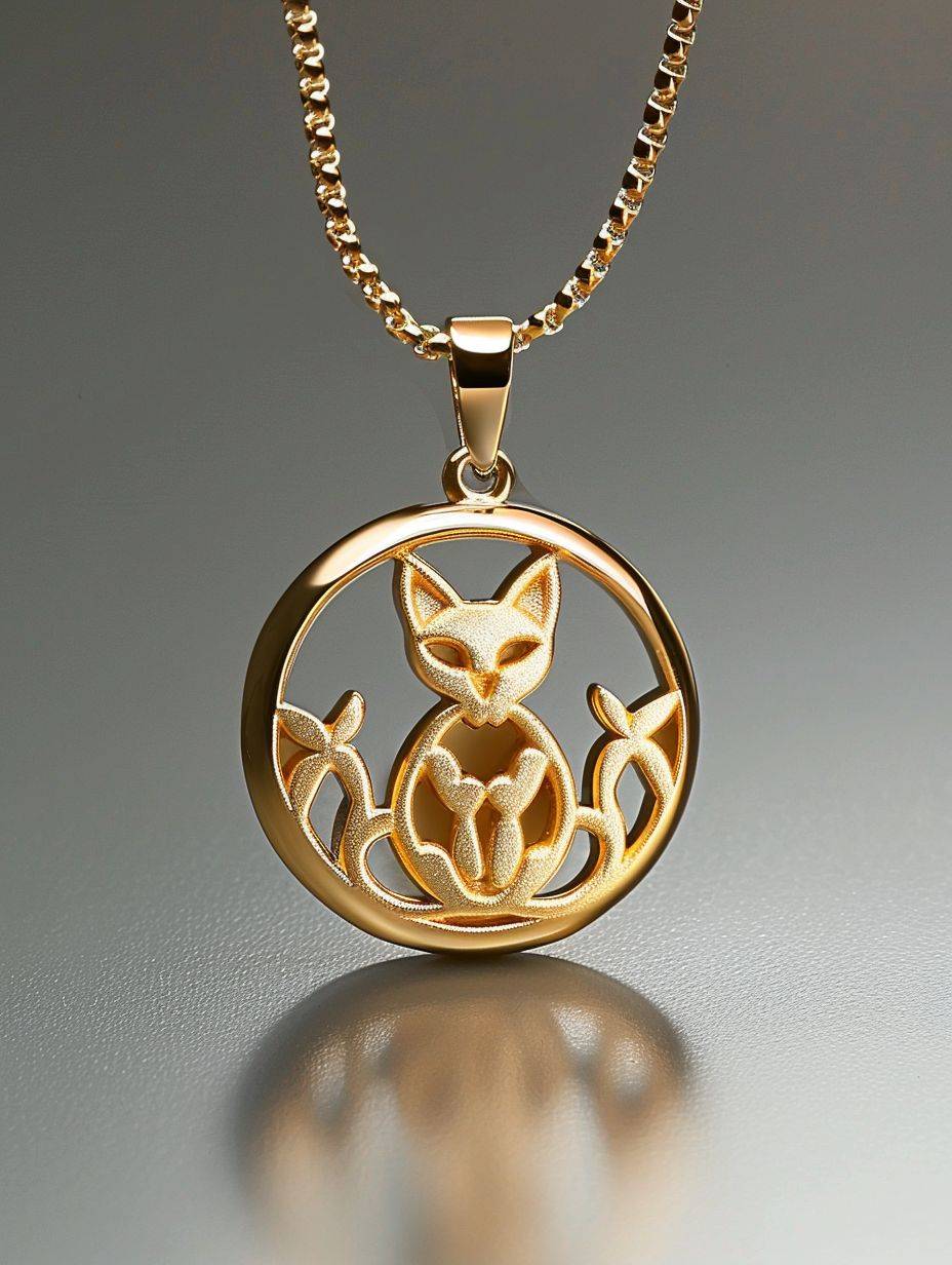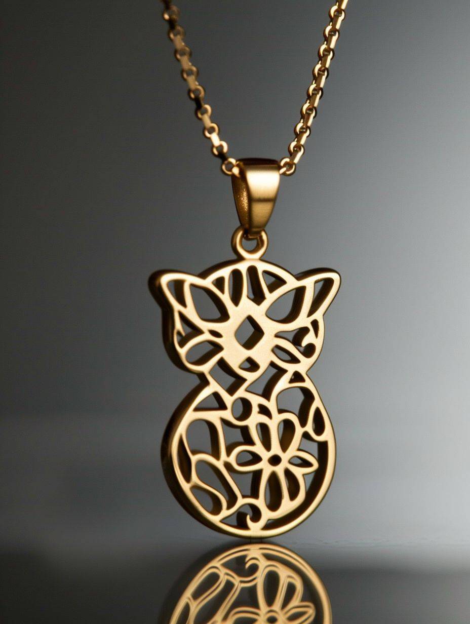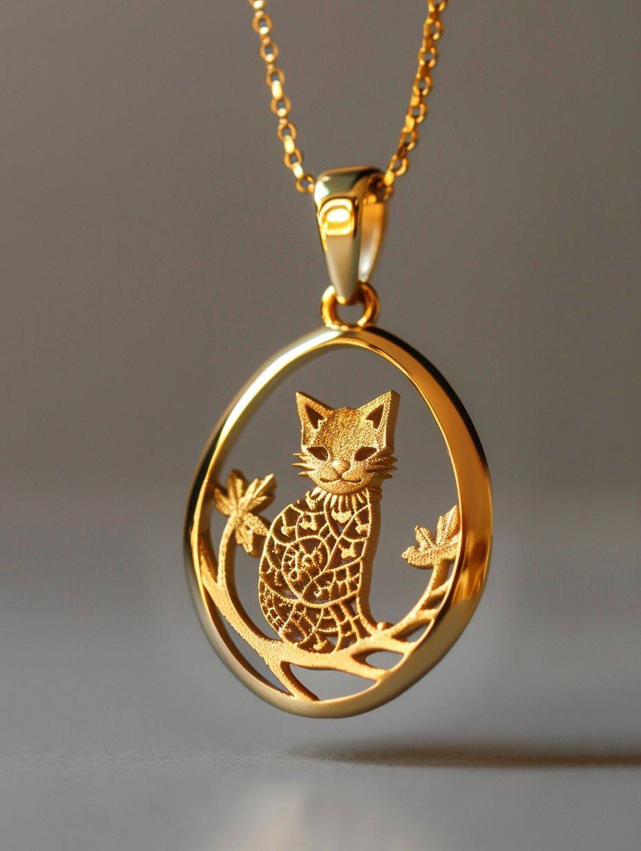 a gold pendant features a cute cat, in the style of cut-out silhouettes, conceptual elegance, metallic finishes, contest winner --ar 3:4